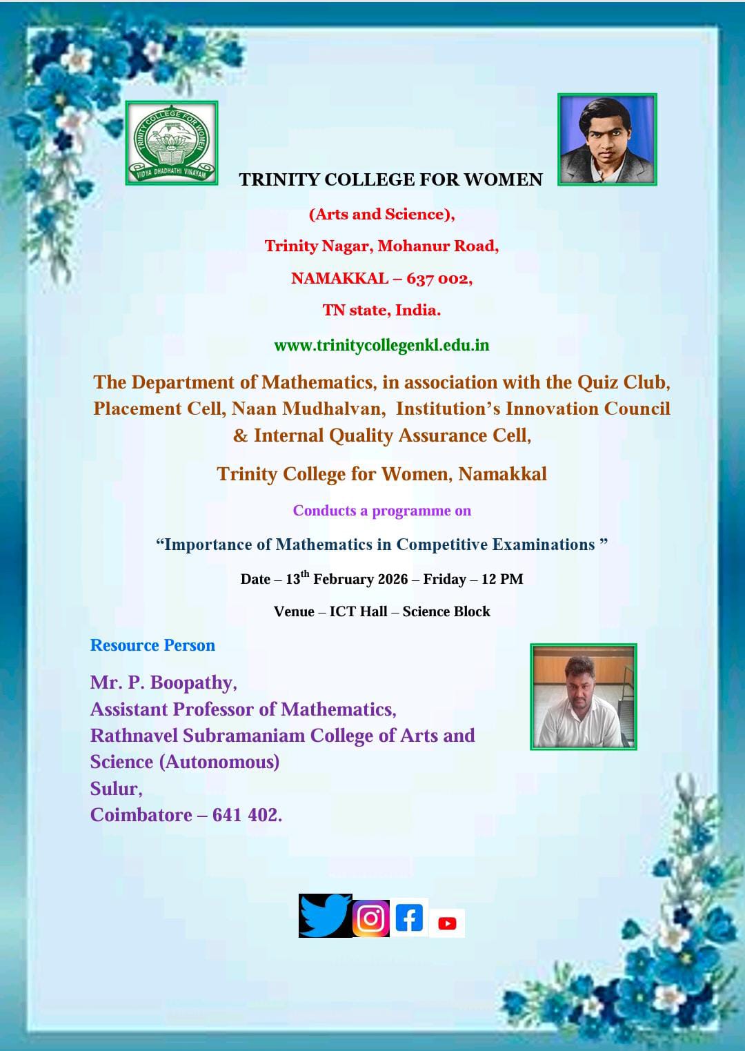 The Department of Mathematics, in association with the Quiz Club, Placement Cell, Naan Mudhalvan, Institution’s Innovation Council & Internal Quality Assurance Cell, Trinity College for Women, Namakkal, conducted a programme titled “Importance of Mathematics in Competitive Examinations” on 13.02.2026 in the College premises.