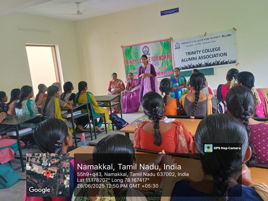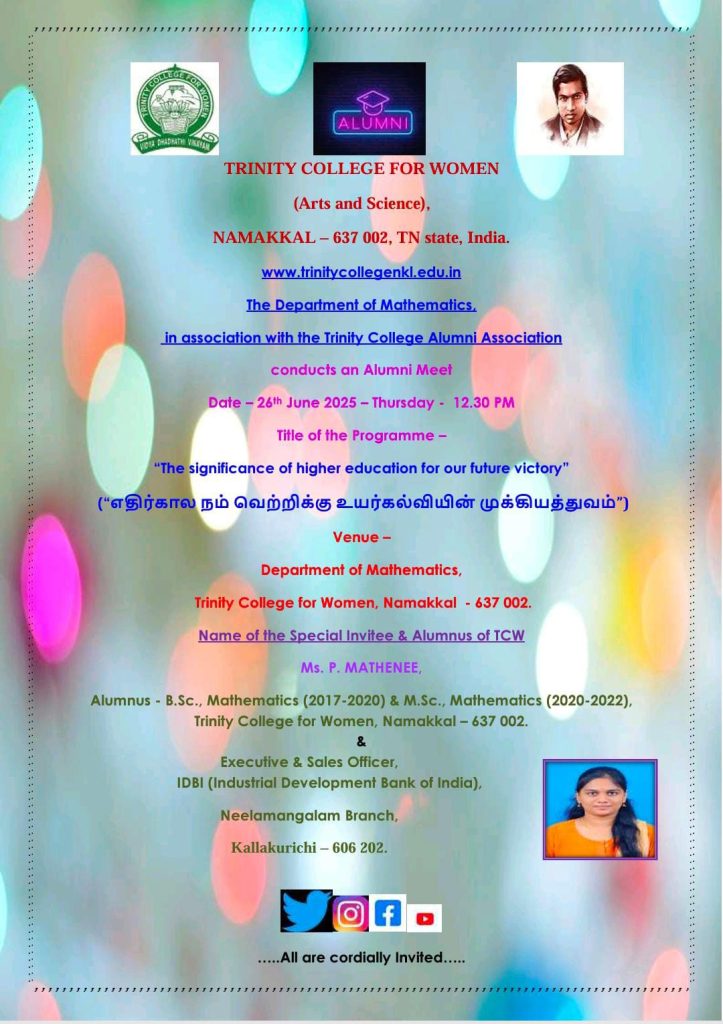 The Department of Mathematics, in association with the Trinity College Alumni Association, Trinity College for Women, Namakkal, conducted an Alumni Meet entitled “The significance of higher education for our future victory” (எதிர்கால நம் வெற்றிக்கு உயர்கல்வியின் முக்கியத்துவம்) on 26th June 2025.