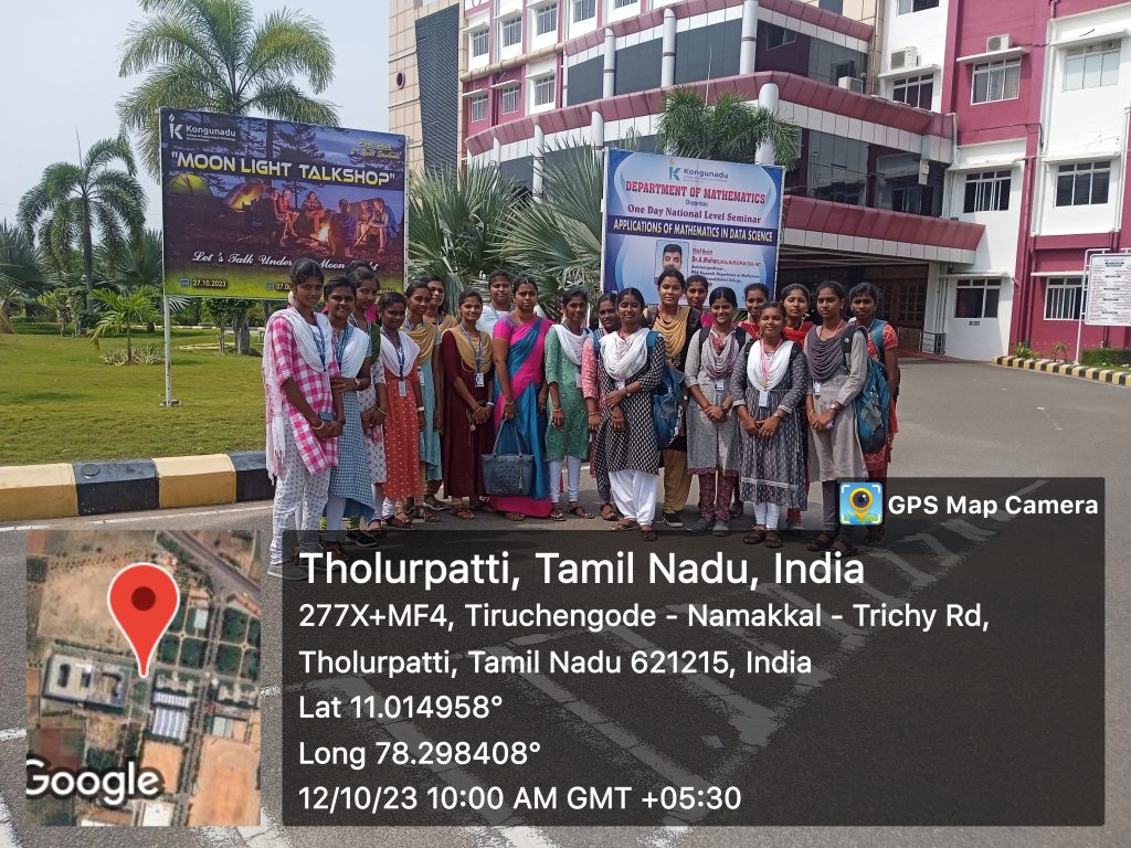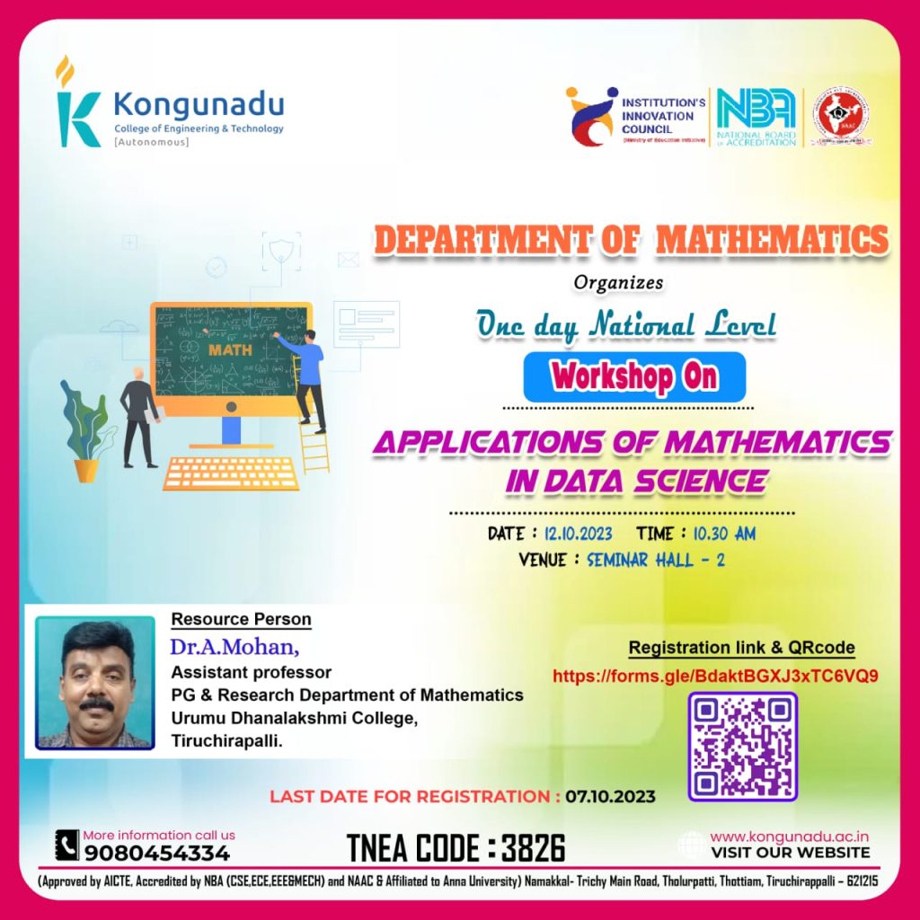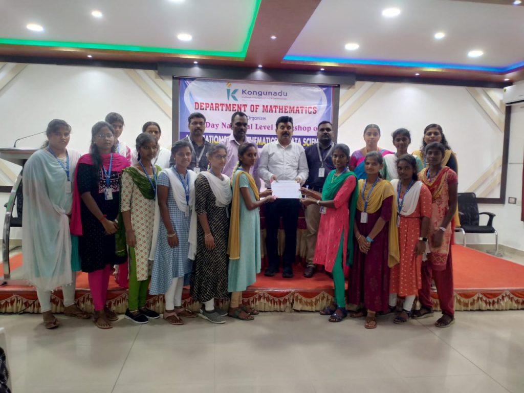 The Department of Mathematics, Kongunadu College of Engineering and Technology, Tholurpatti, Thottiyam, Trichirappalli district, conducted a one-day national-level workshop entitled “Applications of Mathematics in Data Science” on October 12, 2023. Dr. A. Mohan, Assistant Professor, Postgraduate and Research Department of Mathematics, Urumu Dhanalakshmi College, Trichirappalli, was the special guest. On behalf of Trinity College for Women, Namakkal, the following 22 students of mathematics have actively participated: