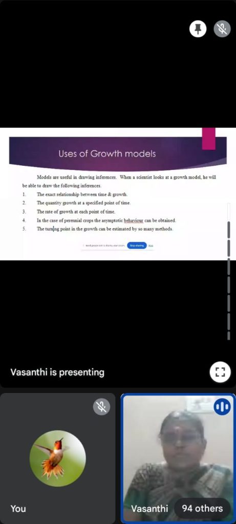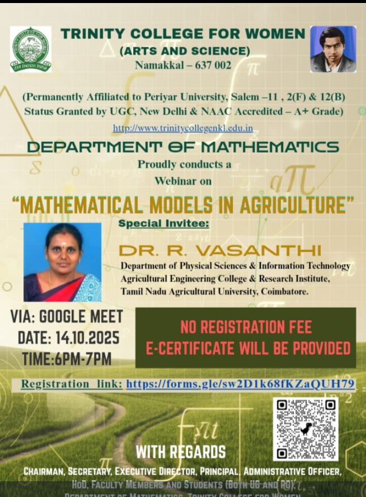 The Department of Mathematics, Trinity College for Women, Namakkal conducted a webinar titled “Mathematics Models in Agriculture” on 14th October 202. It was held through the platform of Google Meet.