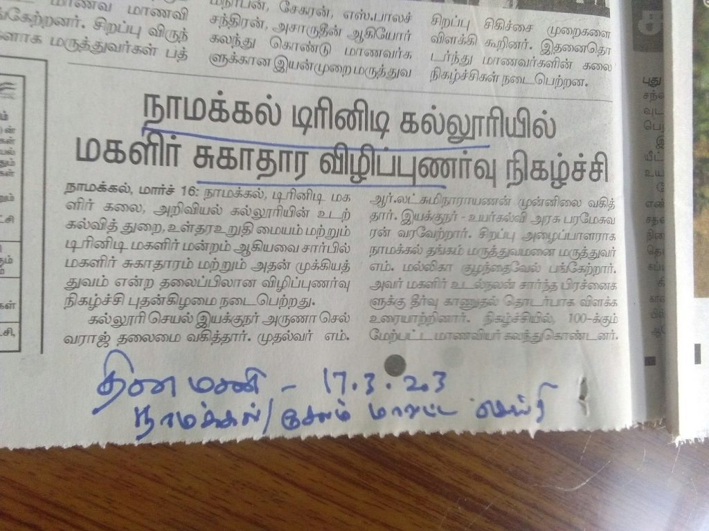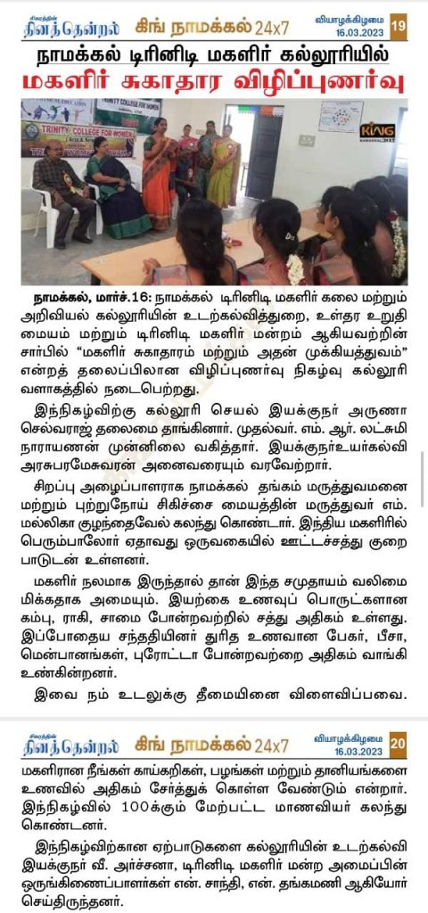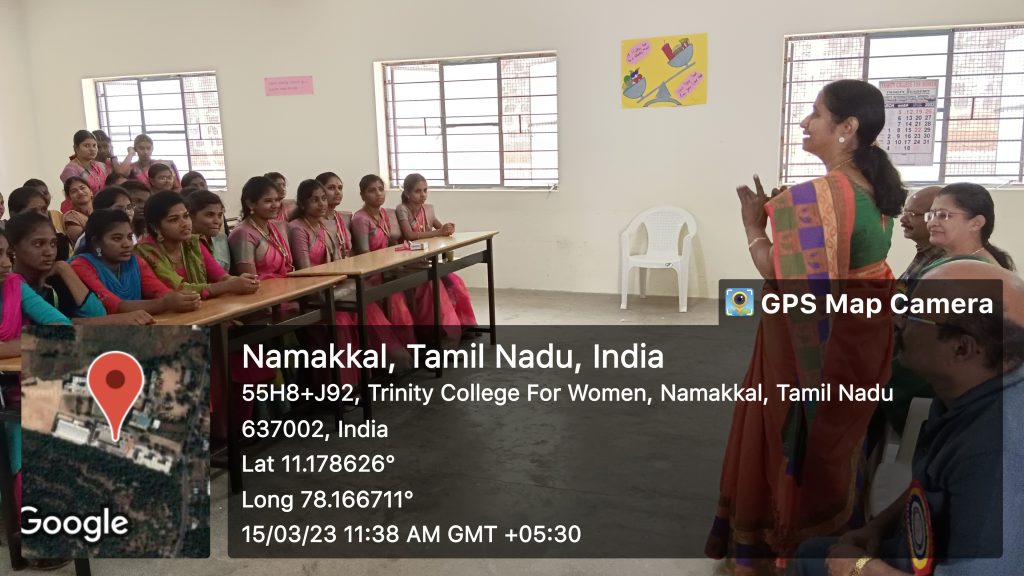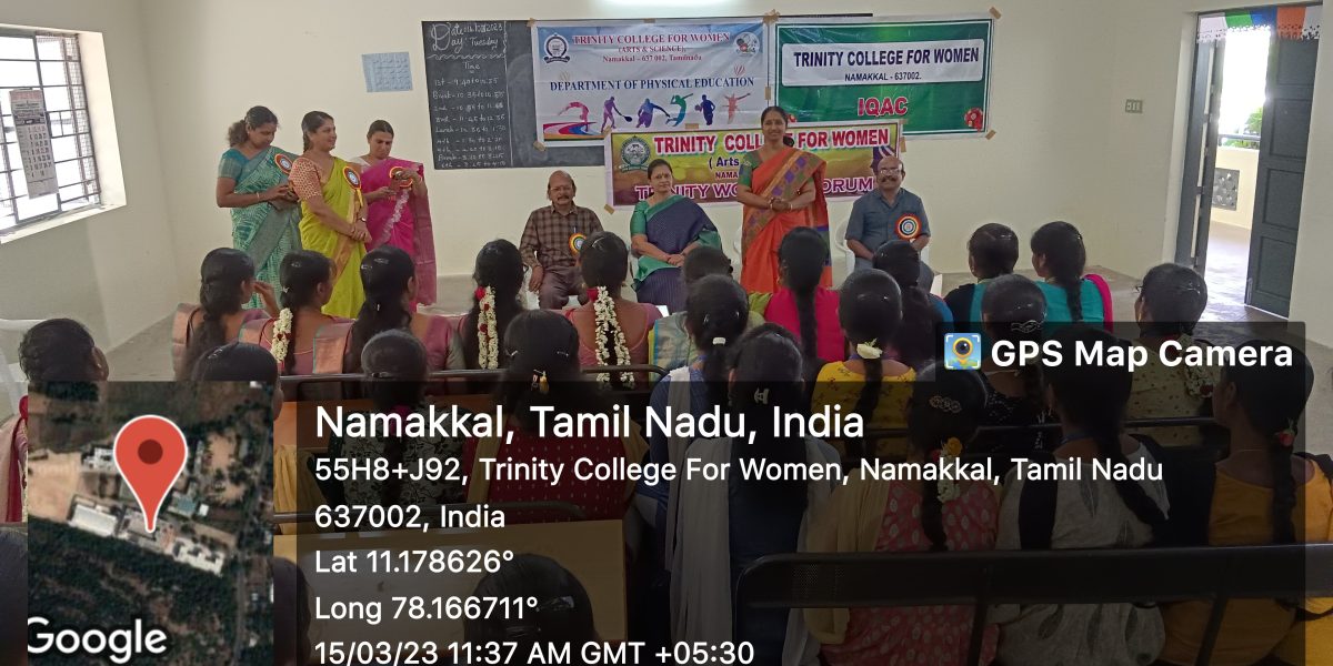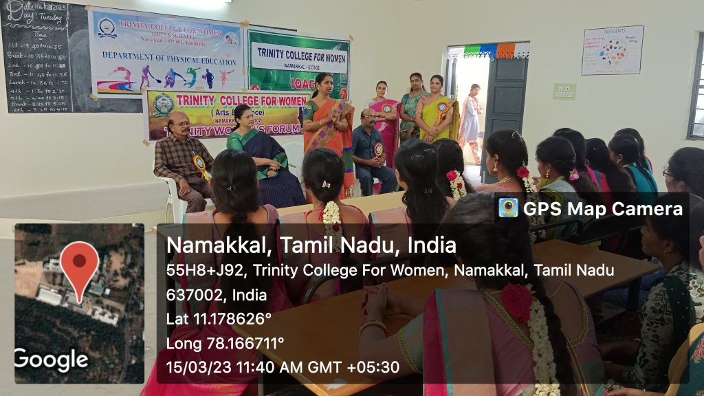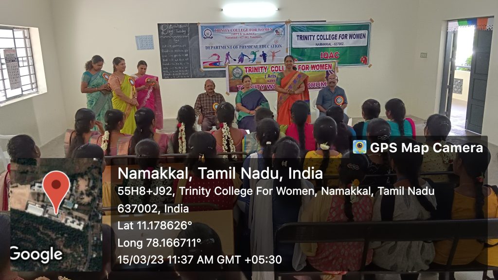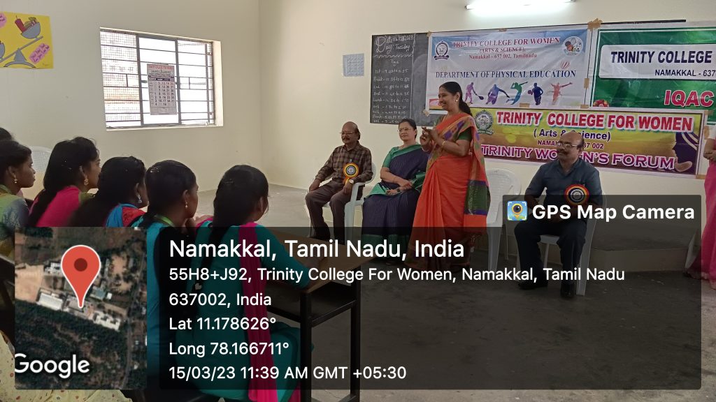 The Department of Physical Education, Internal Quality Assurance Cell and Trinity Women’s Forum of Trinity College for Women, Namakkal conducted an awareness programme in the title of “Female hygiene and its significance” on 15.03.2023. It was held in the College premises.