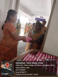 On behalf of Primary Health Centre, Konur, Namakkal and under the aegis of Physical Education department of Trinity College for Women, Namakkal distributed nearly 1000 sanitary napkins to the students of our College. It was conducted as a welfare measure to maintain health and hygiene among the rural students of our College.