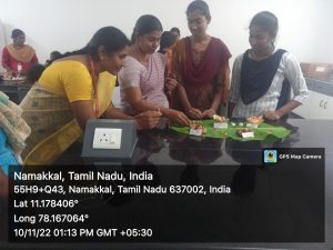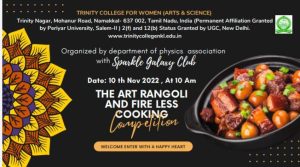 The Department of Physics association with Sparkle Galaxy Club of Trinity College for Women, Namakkal organized a one day programme entitled “The Art Rangoli and Fire Less Cooking” on 10.11.2022. Various events like rangoli and fireless cooking were held on that day. The judges of the events were Mrs. N.Thangamani, AP & HOD of UG Chemistry, Dr. N.Santhi, AP & HOD of PG Chemistry, Dr. G. Selvalakshmi, AP & HOD of PG & Research Commerce, Dr M. Sasikala, AP & HOD of UG Commerce, Dr R Malarvizhi, AP & HOD of PG Mathematics, Dr.P. Saranya, AP & HOD of UG Mathematics and Dr. R. Savithri, AP & HOD of UG Tamil. This programme was arranged by the faculty members of Physics Dr. B. Lakshmi (AP & HOD of Physics), Mrs. B. Kavitha, Dr R. Sakunthaladevi, Mrs. S. Mohanapriya, Mrs. K. Akila, Mrs. V. Kalaivani, Ms. K.Saranya and the students of both UG and PG Physics. Many students of Physics actively took part.