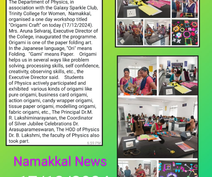 The Department of Physics, in association with the Galaxy Sparkle Club – 2024, Trinity College for Women, Namakkal conducted “Origami Activity” on 17th December 2024 in the Einstein Laboratory, Department of Physics.