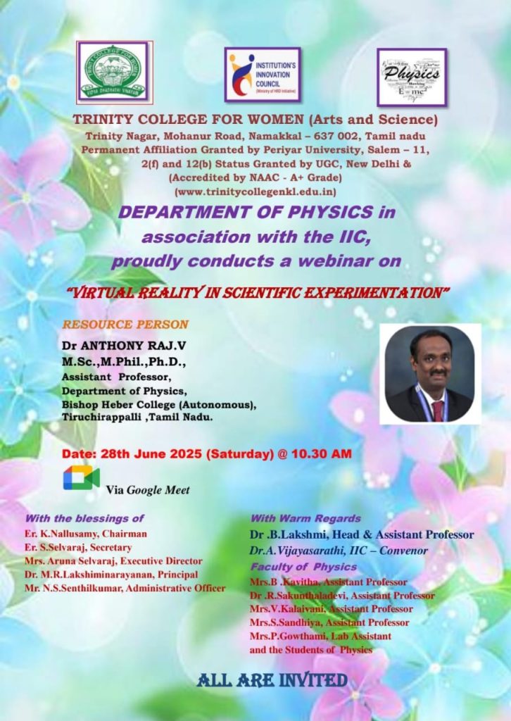 The Department of Physics, in association with the Institution Innovation Council of Trinity College for Women, Namakkal, conducted a webinar titled “Virtual Reality in Scientific Experimentation” on 28.06.2025. On this subject, Dr. V. Anthony Raj, Assistant Professor in Physics, Bishop Heber College (Autonomous), Trichirappalli was the resource person.