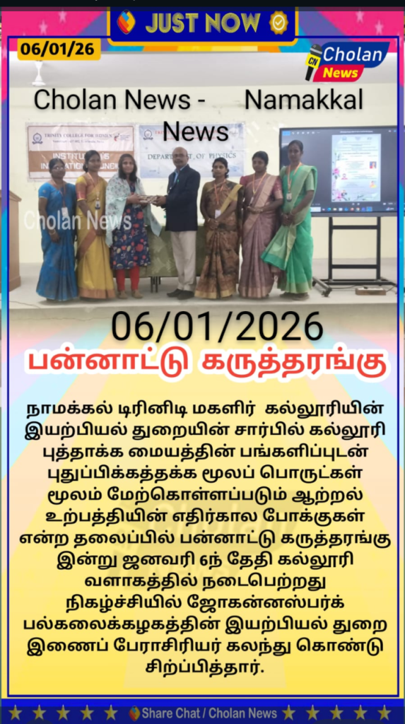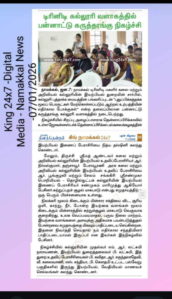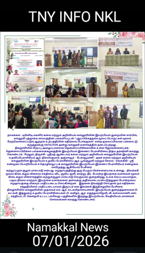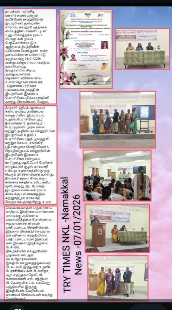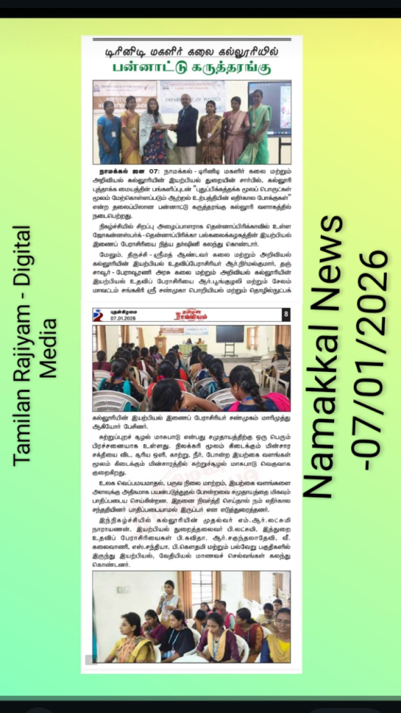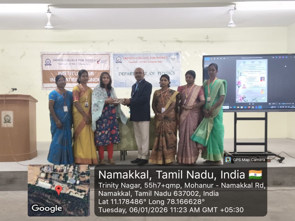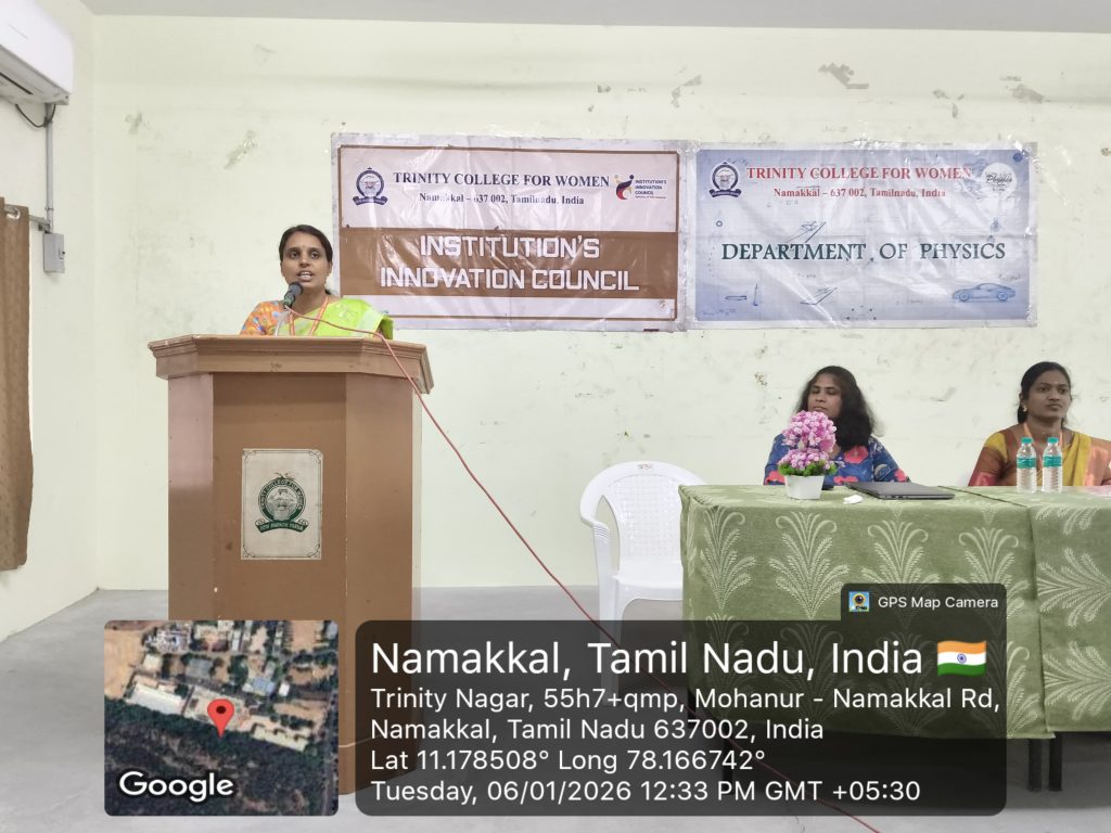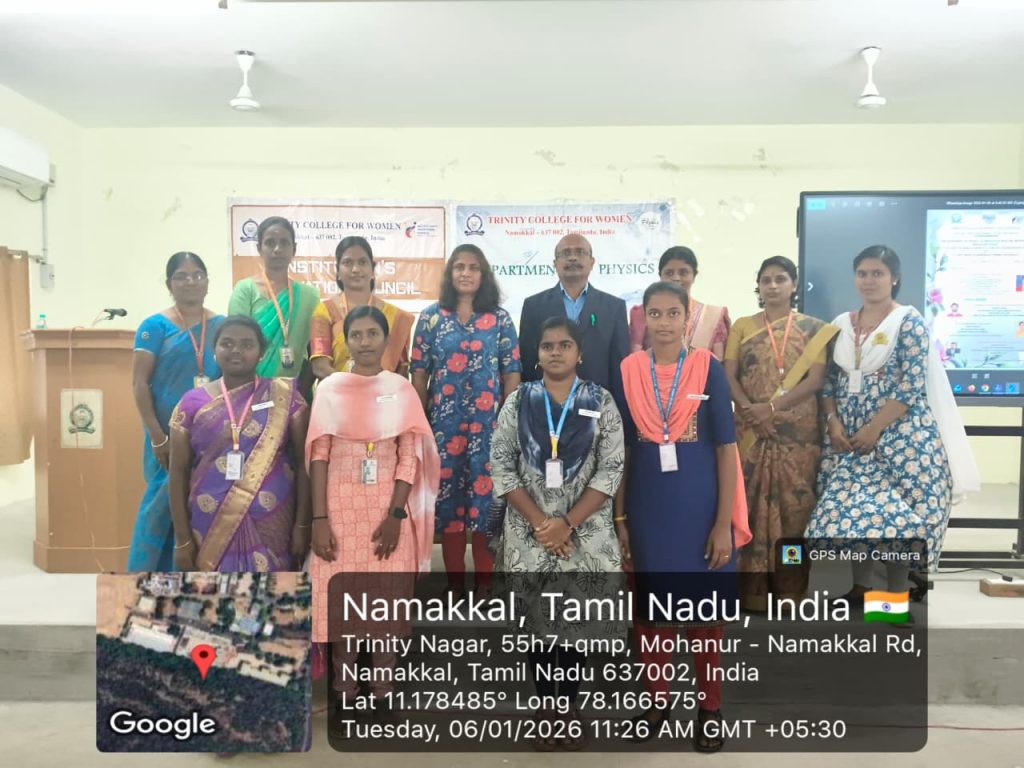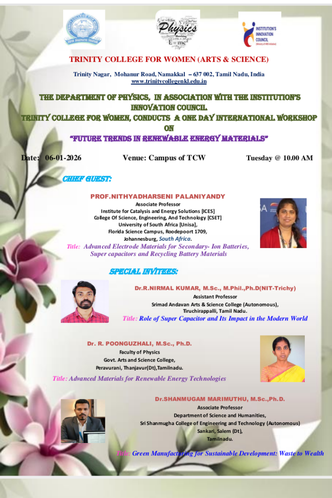 The Department of Physics, in association with the Institution’s Innovation Council, Trinity College for Women, Namakkal, conducted a one-day international workshop titled “Future Trends in Renewable Energy Materials” on 06th January 2026 in the College.