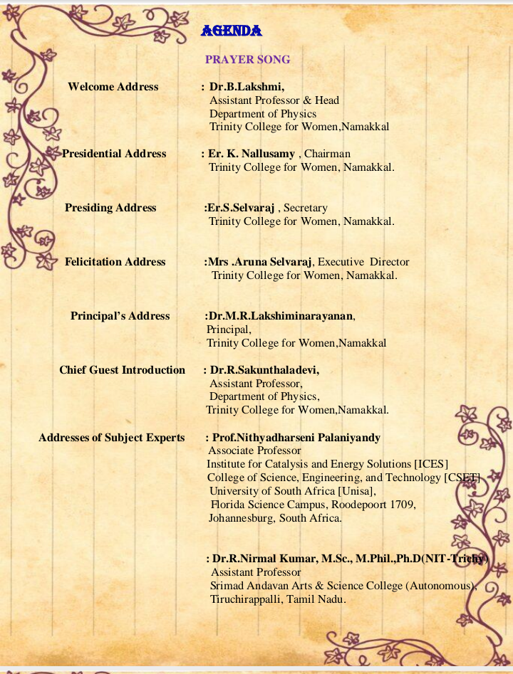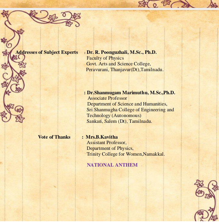 Dr. M.R. Lakshiminarayanan, Principal, presided over the programme. Dr. B. Lakshmi, Assistant Professor and Head, Department of Physics, welcomed the gathering. The chief guests as well as the resource persons were introduced by Mrs. B. Kavitha & Dr. R. Sakunthaladevi, Faculty of Physics of the College.