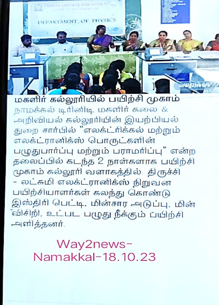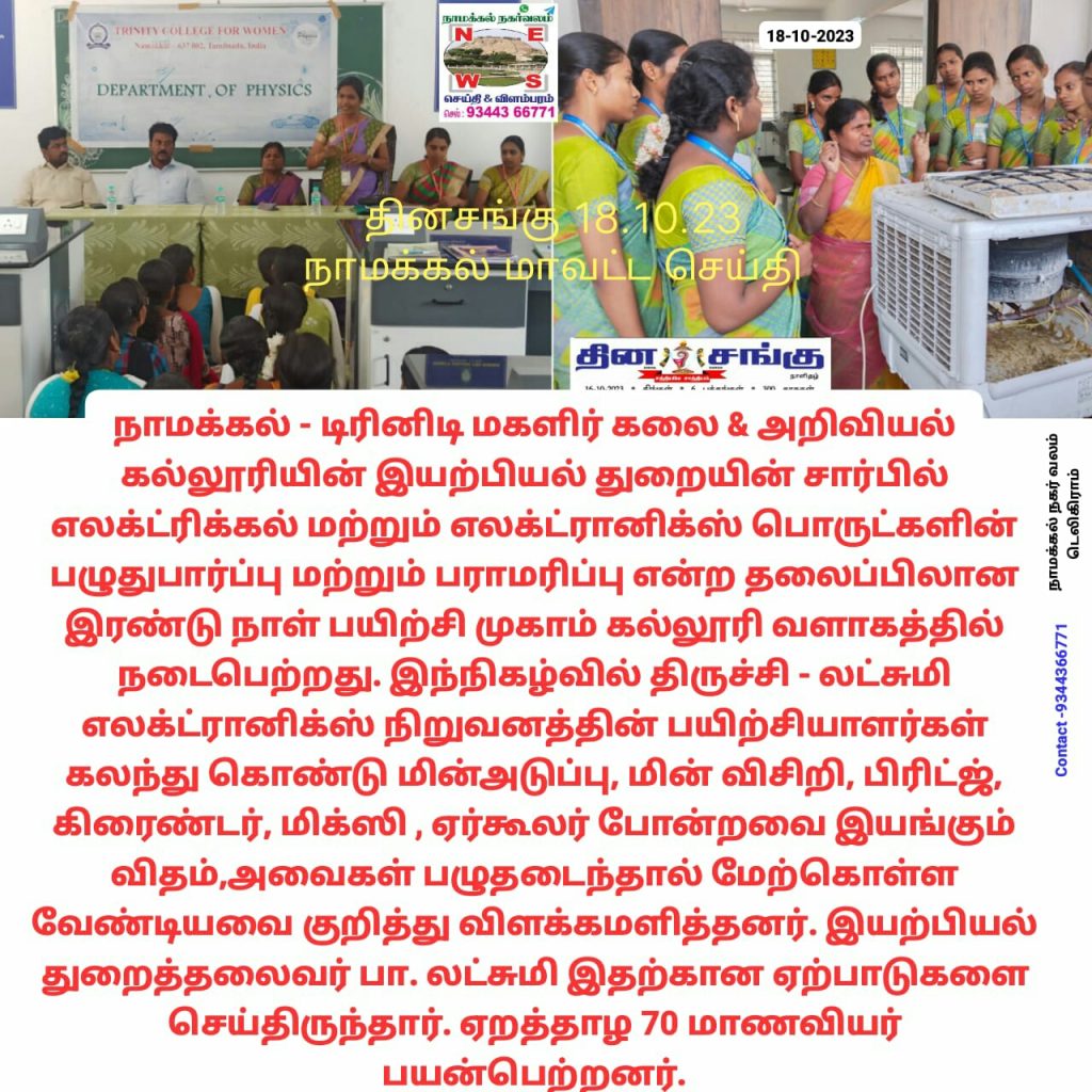 The Department of Physics, Trinity College for Women, Namakkal, conducted a 2-day workshop entitled “Service of Domestic Electrical and Electronic Appliances” on 10.10.2023 and 11.10.2023 in the laboratory of physics. Mrs. M. Kalaiselvi, Proprietor, Lakshmi Electronics, Supplies and Services of Lab Equipment, B-98, VeeramaMunivar Street, Anna Nagar, Thennur, Trichirappalli, and its firm’s faculty members, Mr. V. Sathiyaseelan and Mrs. G. Boopathi, were the subject experts.