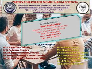 - The Department of Physics, Trinity College for Women, Namakkal organized a soft skill programme in the title of “Team Building Skills” on 08th September 2022. It was held in the place of a mini auditorium. The various title events like Communication Skill activity, Ice breaking session, Brain test, Series activity, Socialization & Networking activity, Bond formation, Collaborates our competitions were held. The students of Physics (Both UG and PG) enthusiastically took part.
