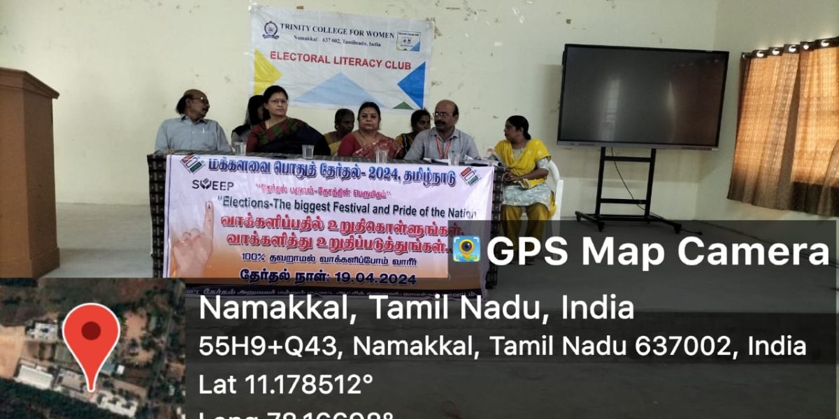 The Electoral Literacy Club, Trinity College for Women, Namakkal, and the Department of Revenue, Namakkal District, jointly conducted an “Election Awareness Program” for the benefit of all the voters of the College” on March 25, 2024, It was held in the Seminar Hall of the College.