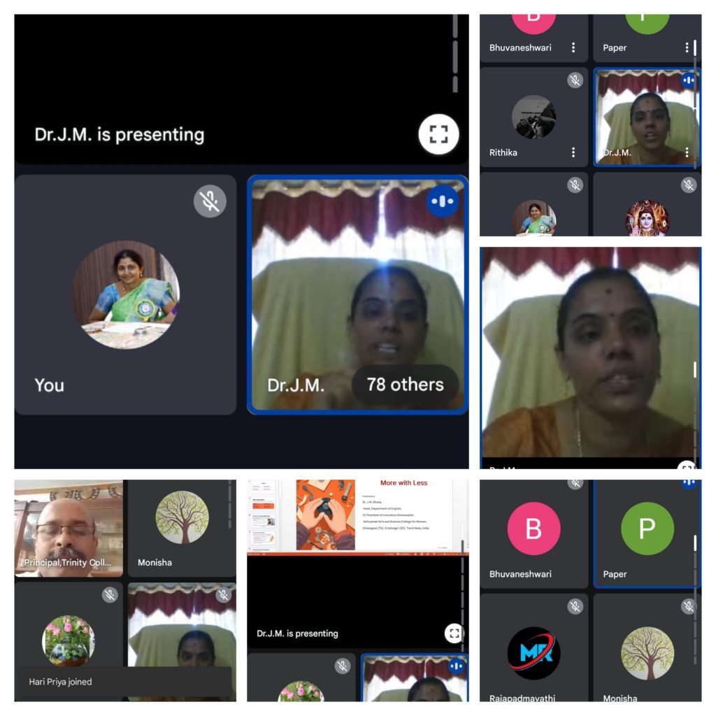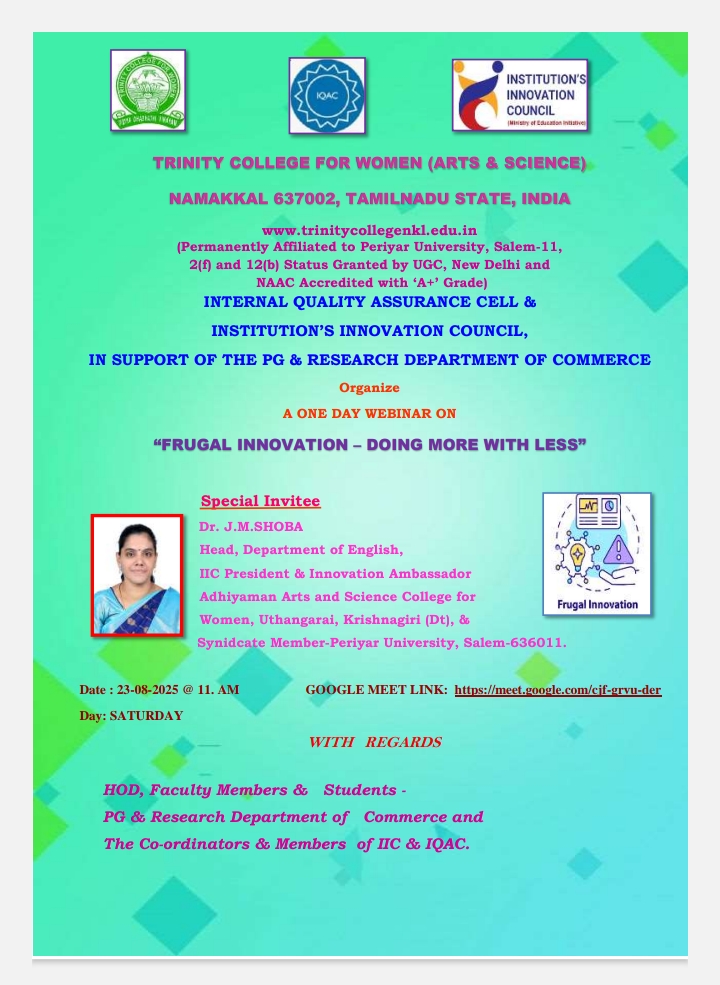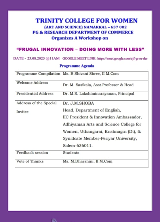 The Entrepreneurship Development Cell, the Institution’s Innovation Council and Internal Quality Assurance Cell, in association with the postgraduate and research departments of Commerce, Trinity College for Women, Namakkal, conducted a webinar programme titled “Frugal Innovation – Doing more with less” on 23rd August 2025. It was held through the platform of Google Meet. Dr. M. R. Lakshiminarayanan, Principal, Trinity College for Women, Namakkal presided over the programme.