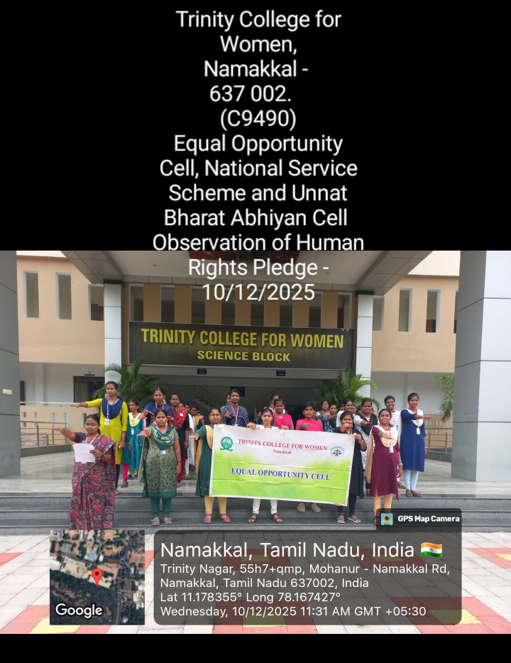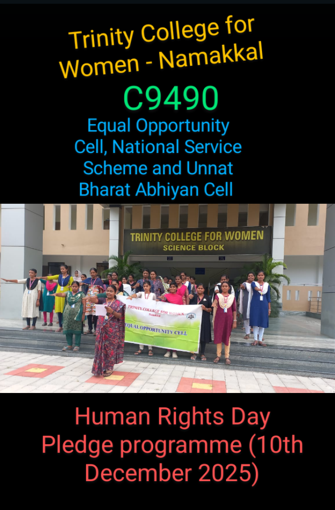 The Equal Opportunity Cell, National Service Scheme and Unnat Bharat Abhiyan Cell, Trinity College for Women, Namakkal observed International Human Rights Day on 10th December 2025 on the College campus in the theme of “Human Rights, Our Everyday Essentials.” Ms. M.V. Mekavarshini, Assistant Professor in English & Member of the Equal Opportunity Cell of the College, administered the oath as regards to the protection of human rights. All the students and faculty members took part.