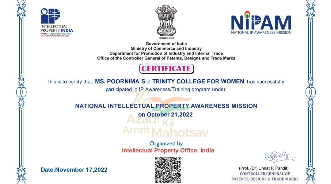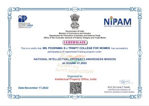 The Government of India – Ministry of Commerce & Industry, Department for Promotion of Industry and Internal Trade, Office of the Controller General of Patents and TradeMarks conducted an intellectual property awareness training programme under the theme of “National Intellectual Property Awareness Mission” (NIPAM) on 21.10.2022. This programme was organized by Intellectual Property Office, India. Ms. S. Poornima, Assistant Professor in English & NODAL Officer of Trinity College for Women, Namakkal is greeted.