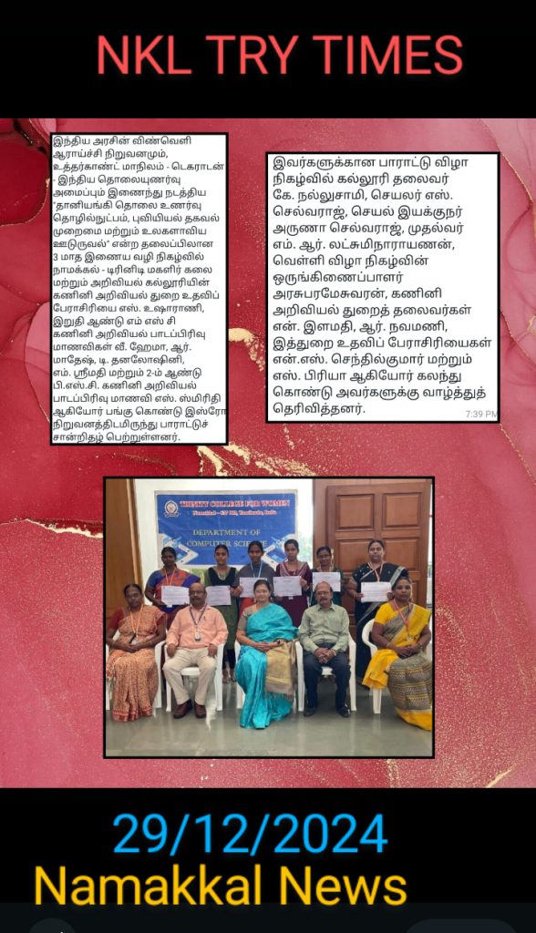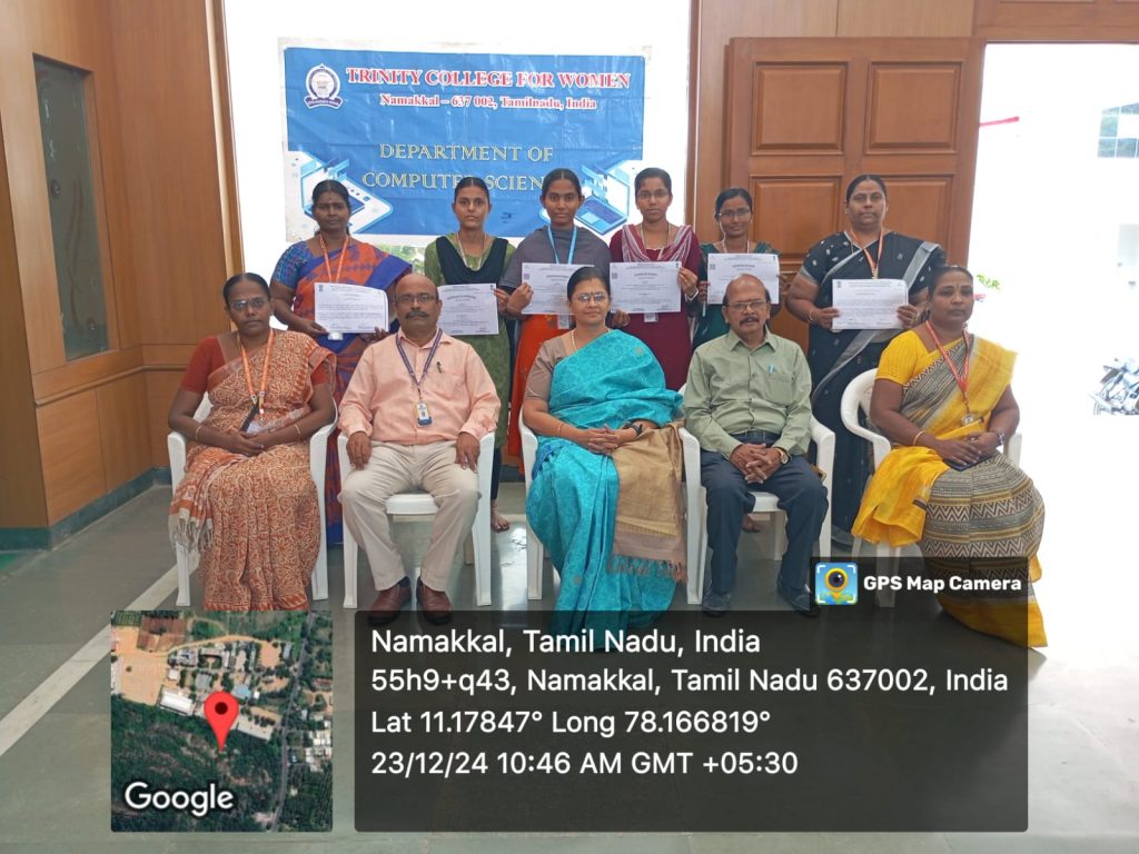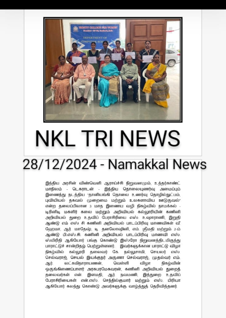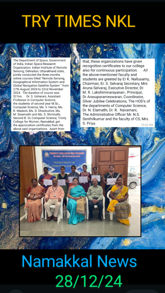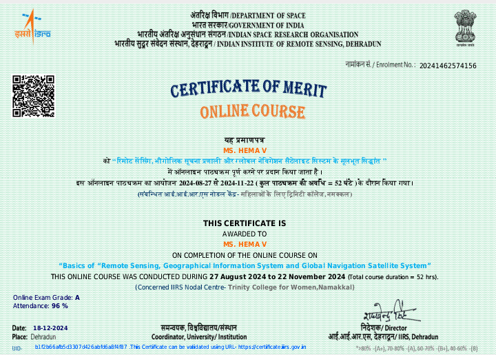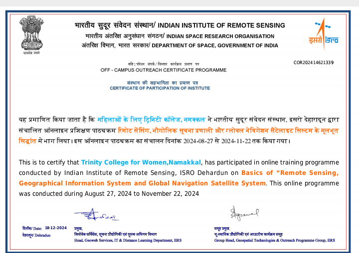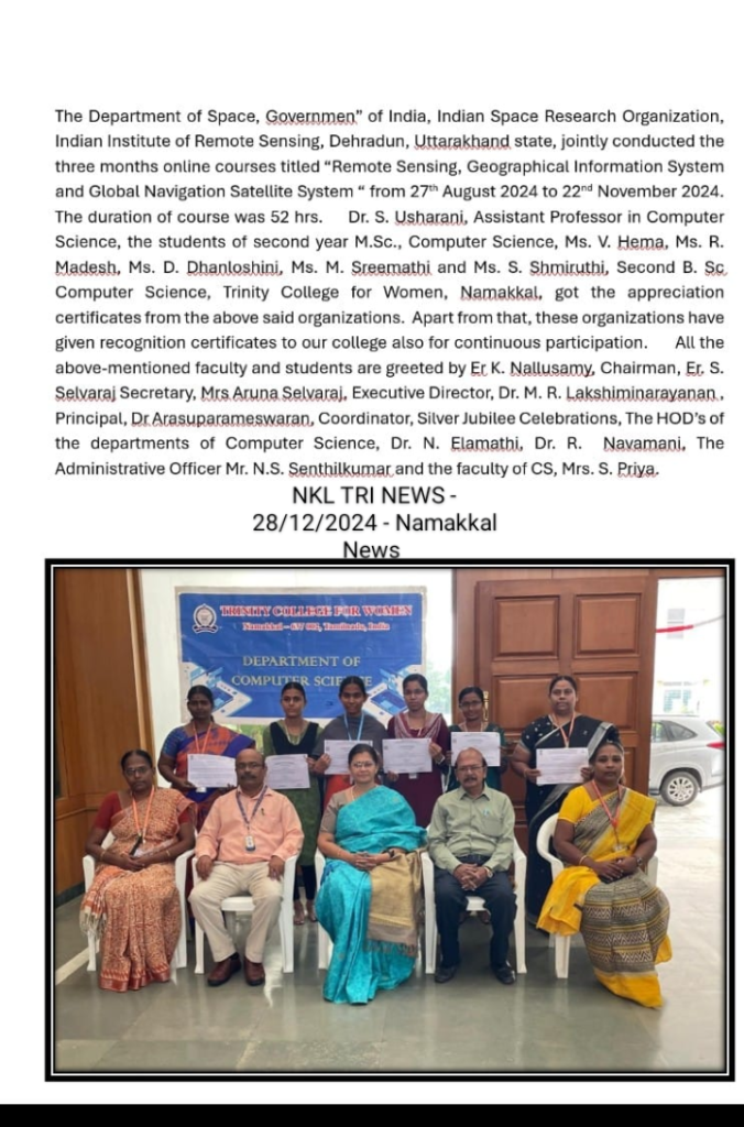 The Indian Institute of Remote Sensing, Dehradun, Uttarkhand state, & Indian Space Research Organization and the Department of Space, Government of India, jointly organized a three-month online training programme from 27th August 2024 to 22ndNovember 2024. In this regard, the following faculty member and students of Computer Science at our college (Trinity College for Women,Namakkal)