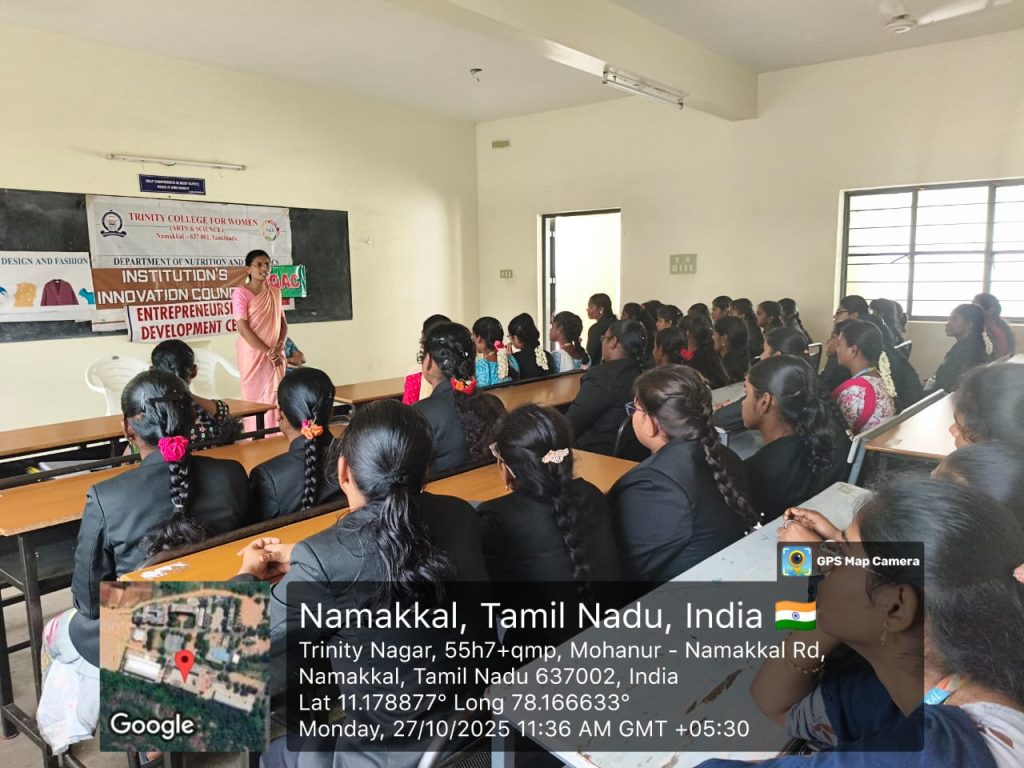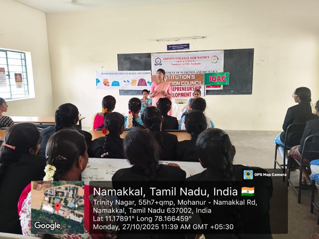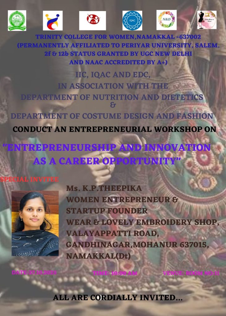 The Institution Innovation Council, Internal Quality Assurance Cell and Entrepreneurship Development Cell, in association with the departments of Nutrition & Dietetics and Costume Design & Fashion, Trinity College for Women, Namakkal, conducted a one-day workshop titled “Entrepreneurship & Innovation as a Career Opportunity” on 27.10.2025 in the college campus.