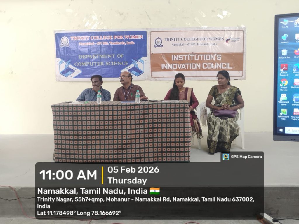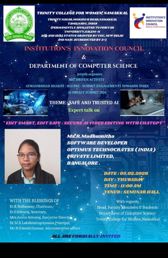 The Institution’s Innovation Council and the Department of Computer Science, Trinity College for Women, Namakkal jointly organized “MIC Driven Activity – Atmanirbhar Bharat – HEI Pre-Summit Engagements towards India”(on the theme of “Safe and Trusted AI) on 05th February 2026 in the College premises.