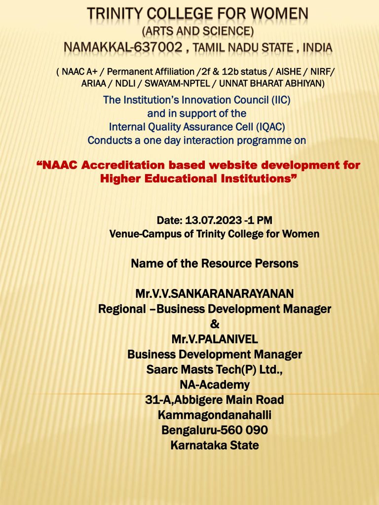 The Institution’s Innovation Council (IIC) and in support of the Internal Quality Assurance Cell, Trinity College for Women, Namakkal, conducted a one-day interaction programme entitled “NAAC Accreditation based website development for higher educational institutions on 13th July 2023