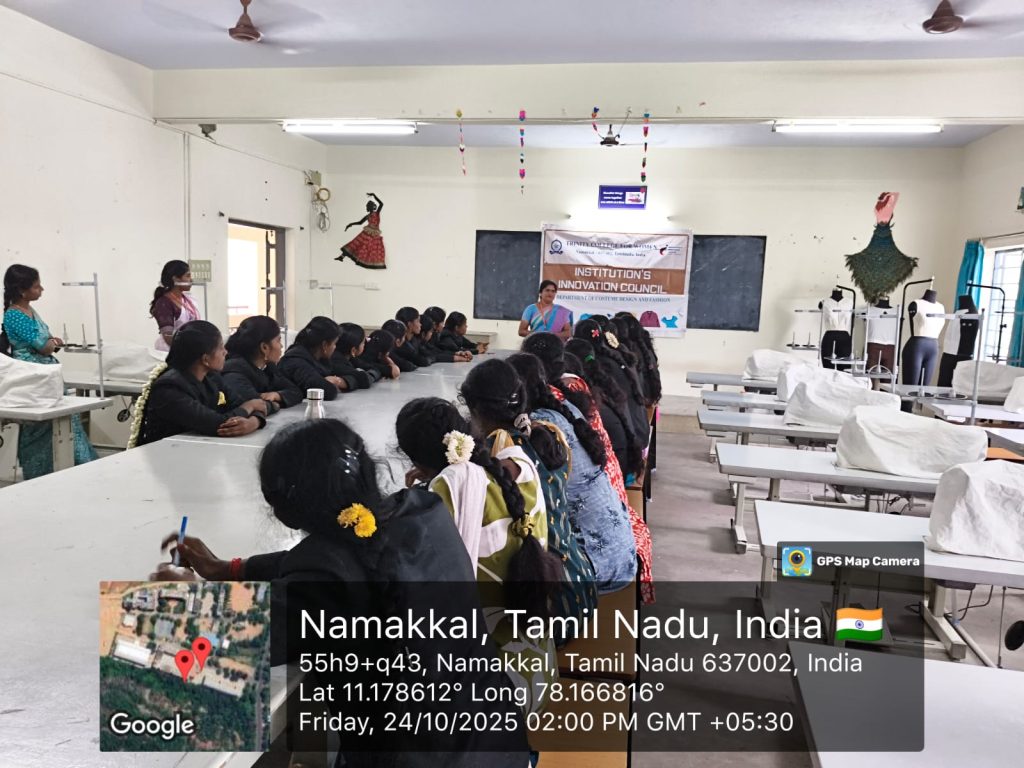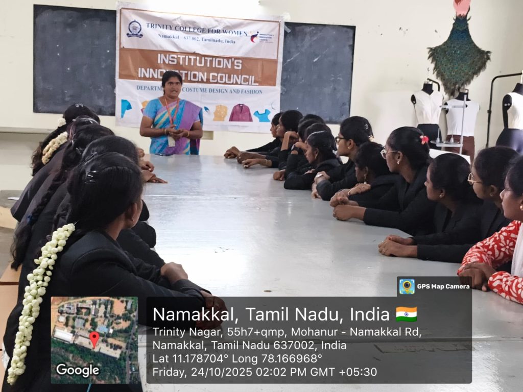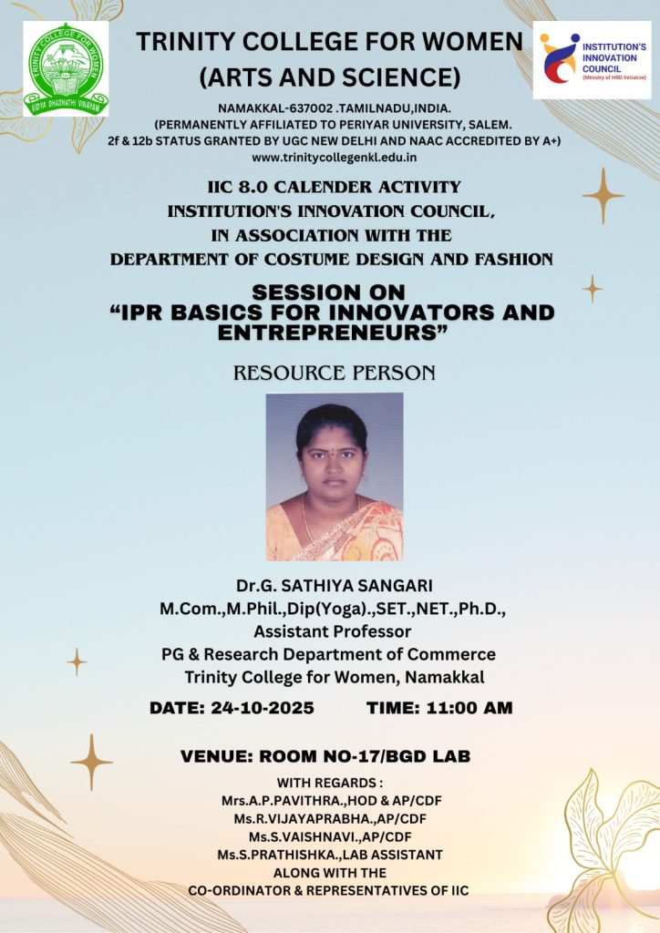 The Institution’s Innovation Council, in association with the Department of Costume Design and Fashion, Trinity College for Women, Namakkal, conducted an “IIC 8.0 Calendar Activity” session on “IPR Basics for Innovations and Entrepreneurs” on 24th October 2025 in the College premises.