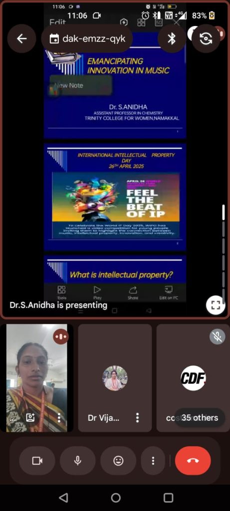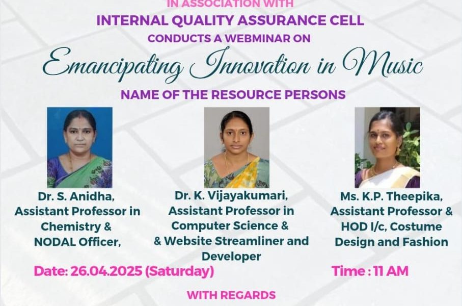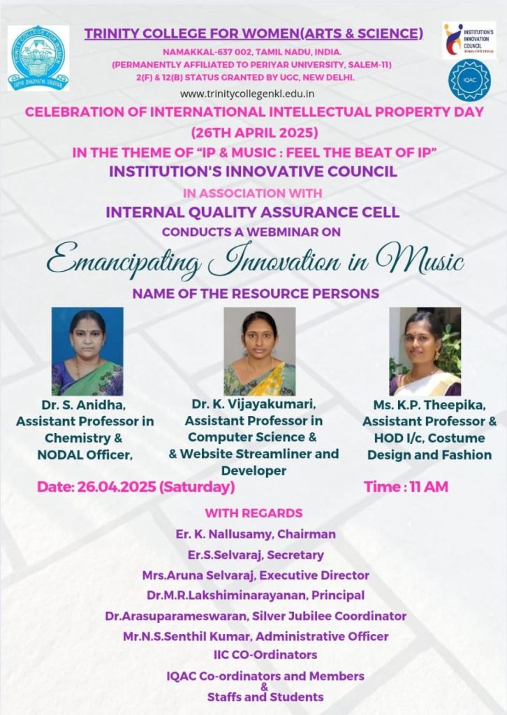 The Institution’s Innovation Council, in association with the Internal Quality Assurance Cell, Trinity College for Women, Namakkal conducted a webinar entitled “Emancipating innovation in Music” on 26th April 2025.