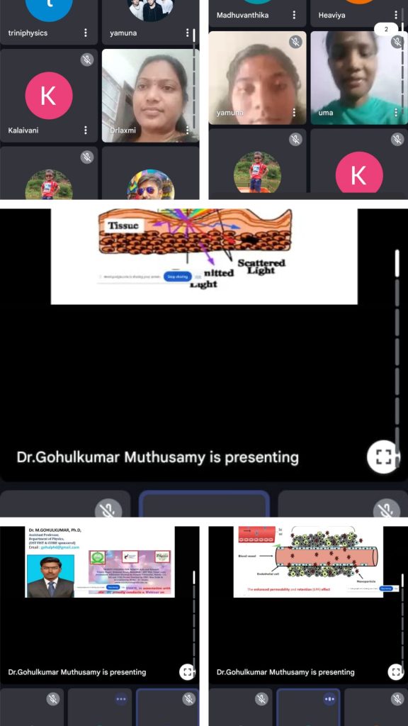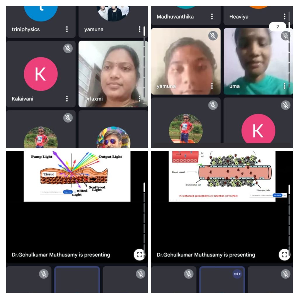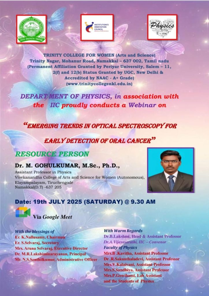 The Institution’s Innovation Council, in support of the department of Physics, Trinity College for Women, Namakkal conducted a webinar event titled “Emerging trends in optical spectroscopy for early detection of oral cancer” on 19th July 2025.  It was held through the virtual mode of Google Meet.