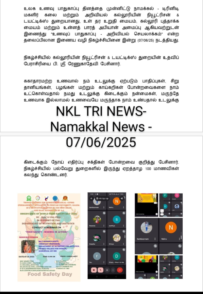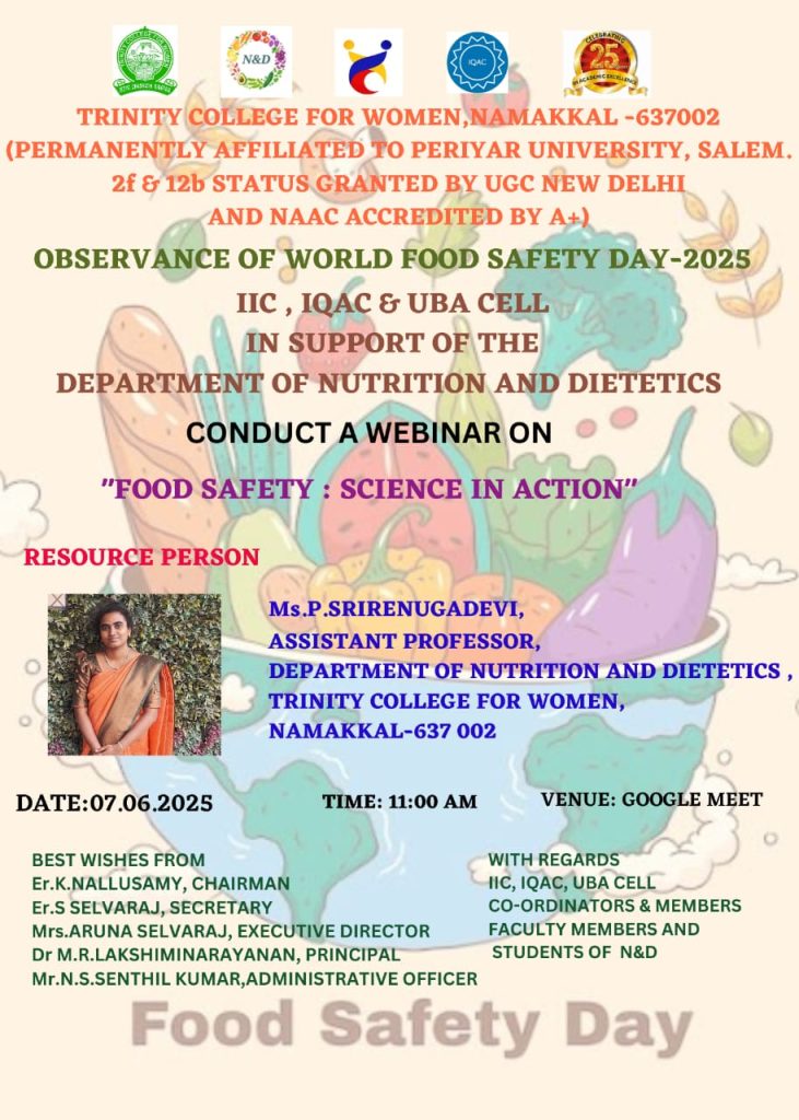 The Institutions Innovation Council, Internal Quality Assurance Cell & Unnat Bharat Abhiyan Cell, in support of the department of Nutrition and Dietetics, Trinity College for Women, Namakkal, observed an international food day on 07th June 2025.