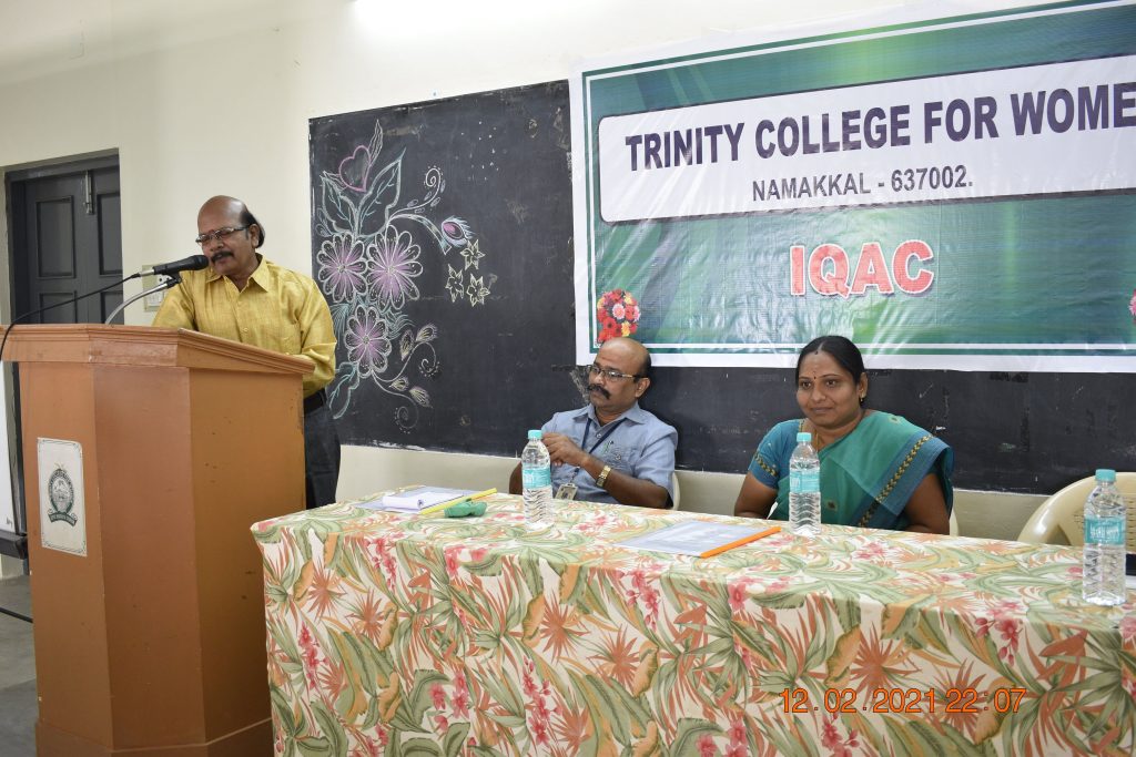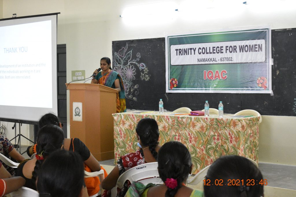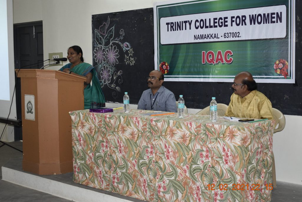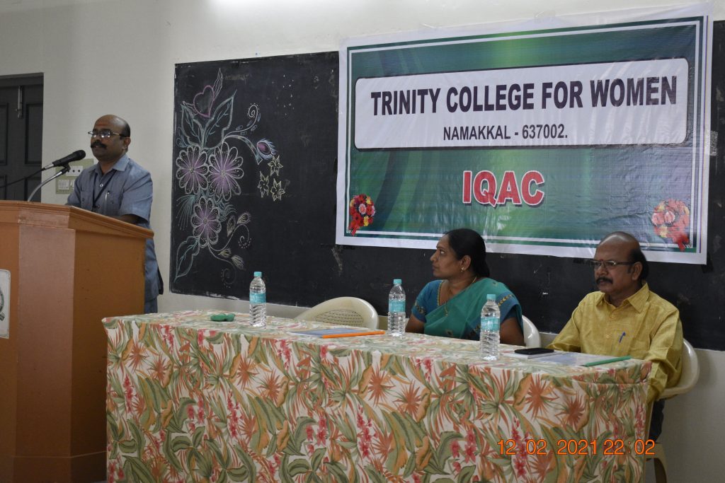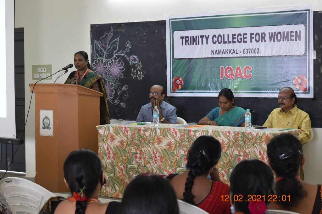 The Internal Quality Assurance Cell (IQAC), Trinity College for Women (Arts and Science), Namakkal conducted a one day seminar programme entitled “NAAC – Revised Assessment and Accreditation” on 13th February 2021. The seminar proposed contemplating on the paradigm shift in higher education scenario and discussions were initiated on how the higher education sector can be restricted in consonance with the changed needs and aspirations. It also targeted the requirements in advancement of quality, reputation and establishment of credibility through students and faculty exchange programmes and other collaborations with high quality national and international higher level organizations.