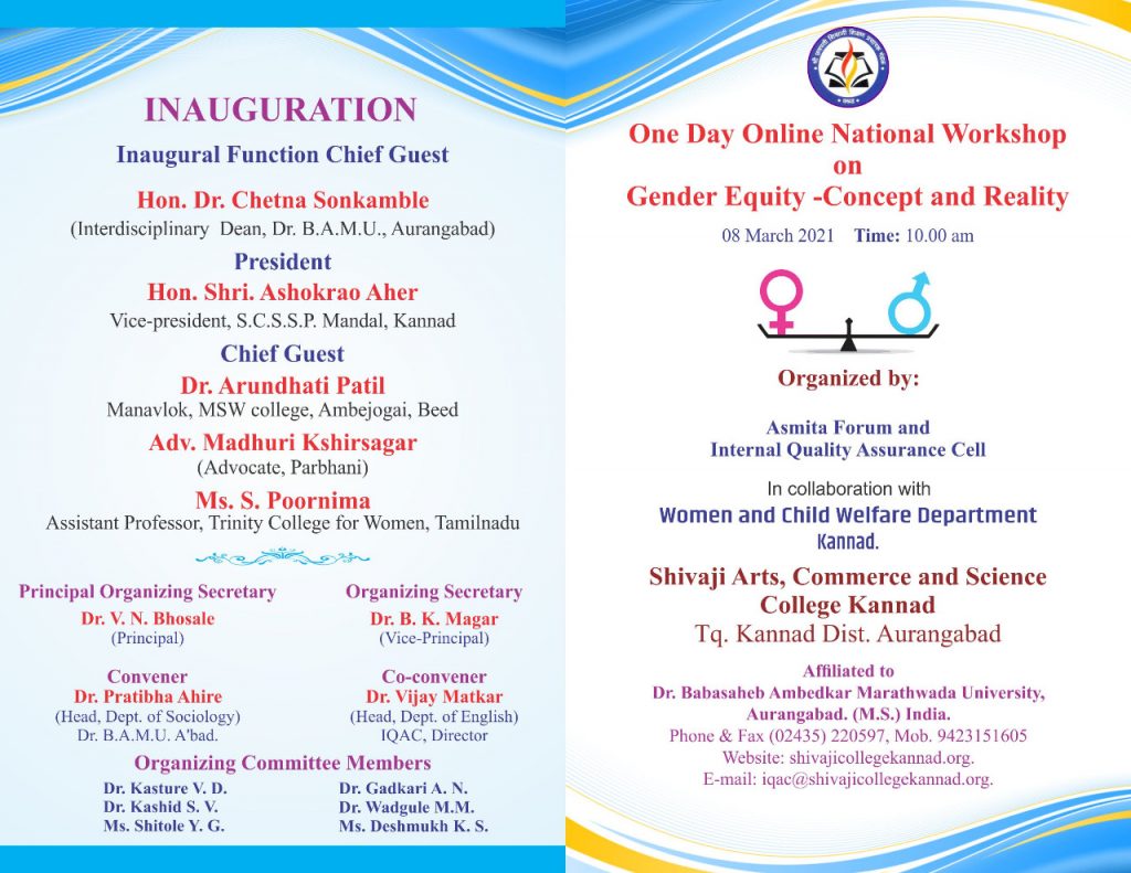The Internal Quality Assurance Cell (IQAC), Asmita Forum and in collaboration with Women and Child Welfare Department of Shivaji Arts, Commerce and Science College (Affiliated to Dr Babasaheb Ambedkar Marathwade University, Aurangabad, Maharashtra state), Kannad Tq, Aurangabad District, Maharashtra state organized a one day online national workshop entitled “Gender Equity – Concept and Reality” on 8th March 2021.