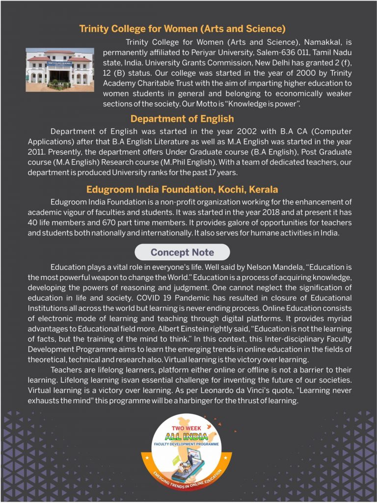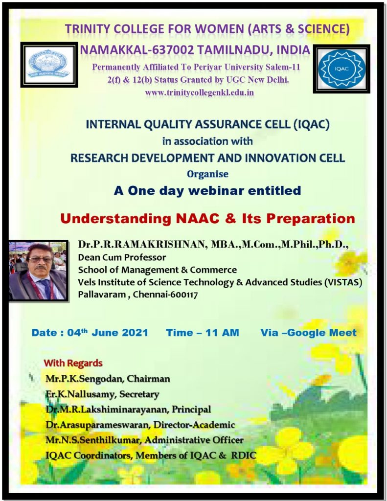 Dr. N. Elamathi, Coordinator of IQAC, Mrs. R. Navamani, Assistant Coordinator of IQAC and Mr. N.S. Senthilkumar, Administrative Officer of the College made arrangements of that webinar. All the faculty members of Trinity College for Women took part in that virtual event.