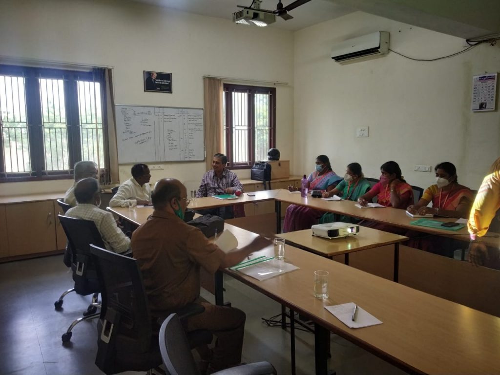 Dr. V. Badrinath, Dean, Corporate Relations & Extension Activities, CUB- Dr Kalam Chair Professor of Management, SASTRA University, Thanjavur was the subject expert. He described various College development activities in particular importance of updating college website and wide coverage to attract more students, significance of creating of quiz club, English Communication Club, starting of NCC, vision and mission of all departments, conducting periodical career guidance programme, national and international level seminars for the benefit of students, focus for fast learners, More concentration to slow learners, appointment of mentor for student’s welfare, essentials of students feedback, organizing 2 week FDP, identification of staff and student empowerment, payment of students fee through the digital mode, preparation of SSR in good way. Focus on alumni old students, procurement of new library books, introduction of Information, communication and technology in all departments, follow up the benchmarking institutions for NIRF ranking, more concentration on research and development, necessity of introduction of B.Voc (Bachelor of Vocation Skilled Based Programmes) staff and students participation in SWAYAM courses, project proposal forward to the various funding agencies in regularly and so on.