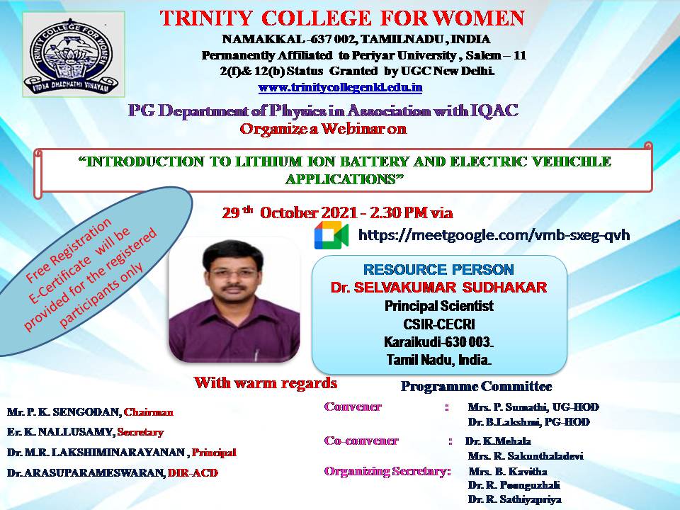 The Post Graduate Department of Physics in association with Internal Quality Assurance Cell of Trinity College for Women, Namakkal organized a one day webinar in the title of “Introduction to Lithium Ion Battery and Electric Vehicle Applications” on 29.10.2021.