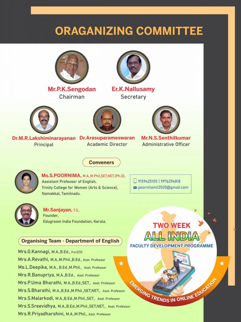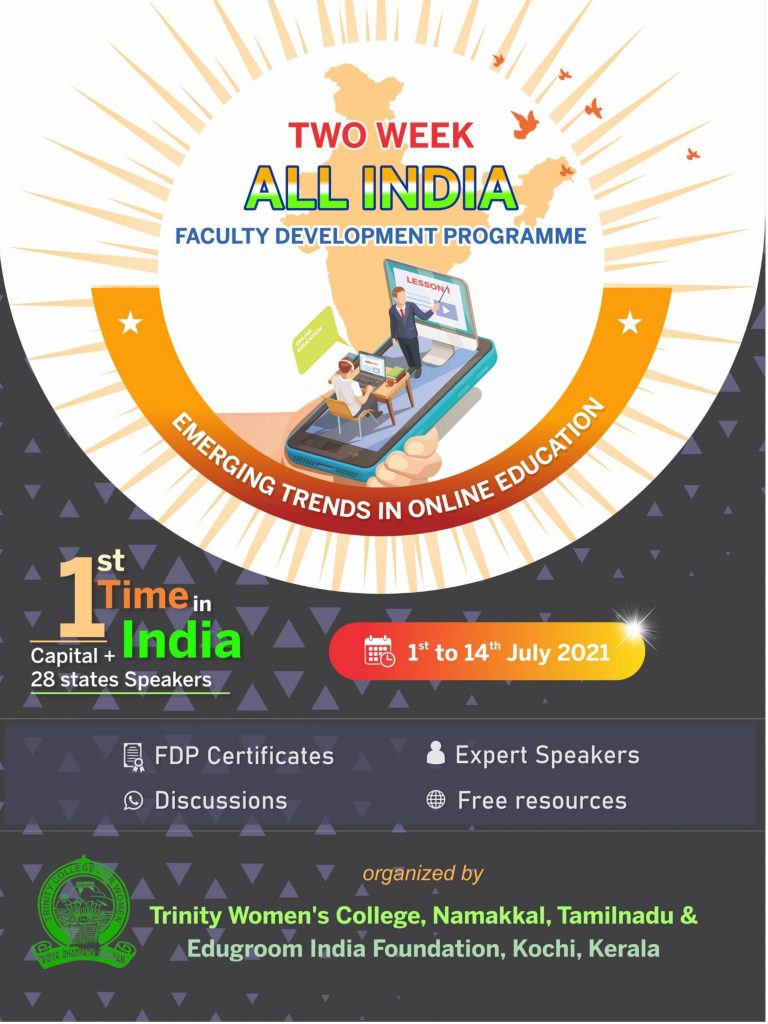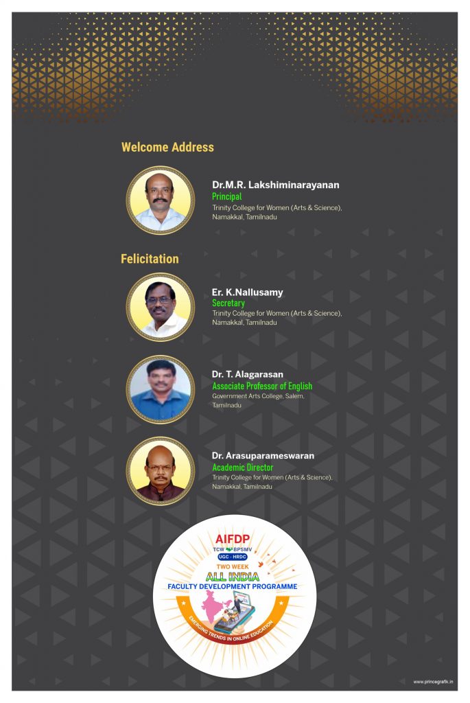 Our College Trinity College for Women (Arts and Science), Namakkal, Tamil Nadu, Edugroom India Foundation, Kochi, Kerala in collaboration with University Grants Commission-Human Resource Development Centre, Bhagat Pool Singh Mahila Vishwavidyalaya, Sonipet, Haryana state conducted a 2 week All India Faculty Development Programme from 01st July 2021 to 14 July 2021. On this subject, the inauguration function was held on 01st July 2021 @ 9.30 AM. Dr M.R. Lakshiminarayanan, Principal of Trinity College for Women (Arts and Science), Namakkal welcomed the gathering. Mr. T.S. Sanjayan, Founder, Edugroom India Foundation, Kochi, Kerala introduced the chief guest. Prof. Dr. R.K. Anayath, H’ble” Vice-Chancellor, Bhagat Pool Singh Mahila Vishwavidyalaya, Sonipet, Haryana state delivered his inaugural address. The keynote address was given by Dr. Shafali Nagpal, Director – I/c, UGC-HRDC, Bhagat Pool Singh Mahila Vishwavidyalaya, Sonipet, Haryana state, Er. K. Nallusamy, Secretary, Dr. Arasuparameswaran, Director – Academic of the College and Dr. T. Alagarasan, Associate Professor in English, Government Arts College (Autonomous) Salem offered their felicitation address.