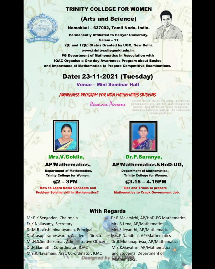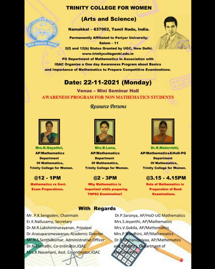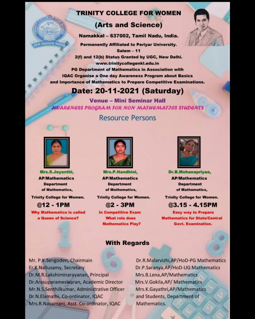 | 02 | 20.11.21 | 2 PM to 3 PM | Mrs. P. NandhiniAP/MathematicsTrinity Collegefor Women | In competitive examination what role does Mathematics play? |
