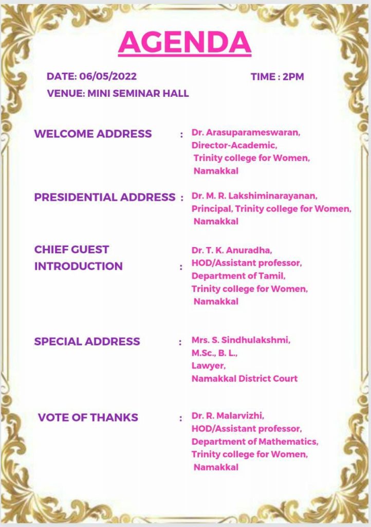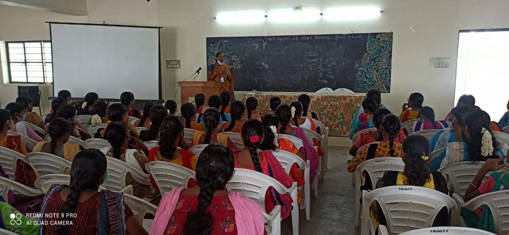 Mrs. S. Sindhulakshmi, Lawyer, Namakkal District Court, Namakkal was the resource person. Dr. M.R. Lakshiminarayanan, Principal of the College presided over the programme. Dr. Arasuparameswaran, Director – Academic delivered the welcome address. Dr. T.K. Anuradha, Assistant Professor and Head, Post Graduate Department of Tamil introduced the chief guest.