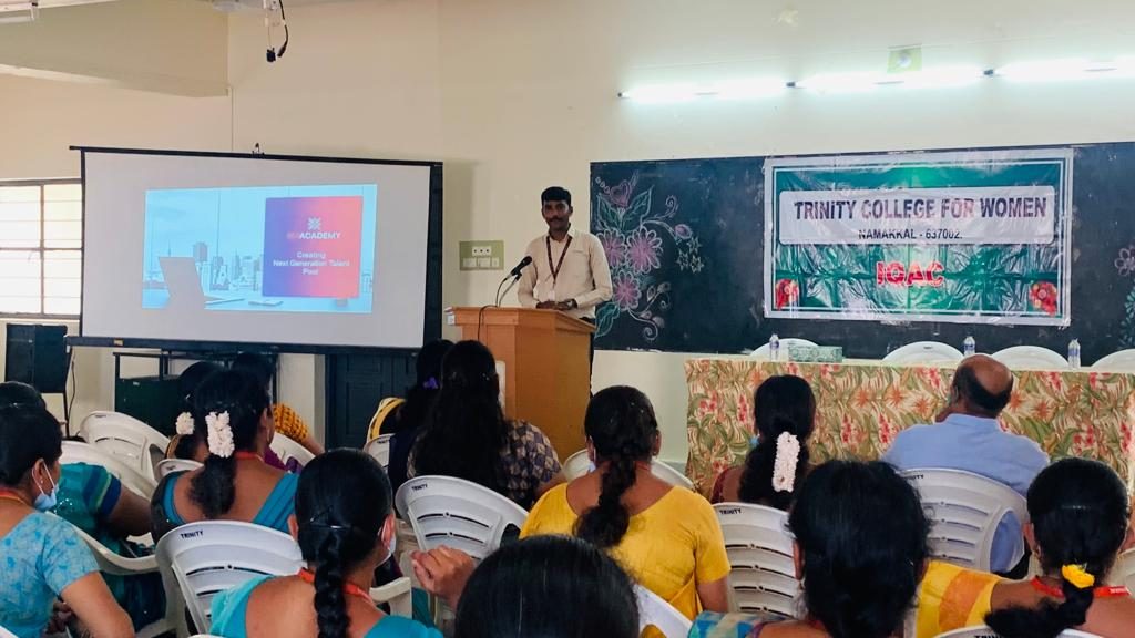A workshop on “Role and contribution of ICT in higher education” organized by the Internal Quality Assurance Cell and the Post Graduate Department of Computer Science of Trinity College for Women, Namakkal on 7th October 2021. Mr.P.K. Sengodan, Chairman of the College, presided over the programme. Er. K. Nallusamy, Secretary, Dr. M.R. Lakshiminarayanan, Principal & Dr. Arasuparameswaran, Director – Academic of the College offered their felicitation address. Mrs. P. Umabharathi, Assistant Professor in English compiled the programme. Mrs. K. Mehala, Assistant Professor in Physics welcomed the gathering. Mr. V. Lakshmana Narayanan, Relationship Manager –Academic Operations, ICT Academy, Coimbatore was the special invitee. In his address, he pointed out that technology, modern ideas and innovations have been introduced in all departments, and Teaching jobs are no exemption. Globalization, Privatization and Liberalization have all resulted in globally enhanced educational methods. It’s inevitable in the present context that Teachers have to update themselves in their areas owing to world wide competition. He also proceeded to present on Teacher Development Technology, skill development, digital methods of education, research & development, memorandum of understanding with industries and so on.