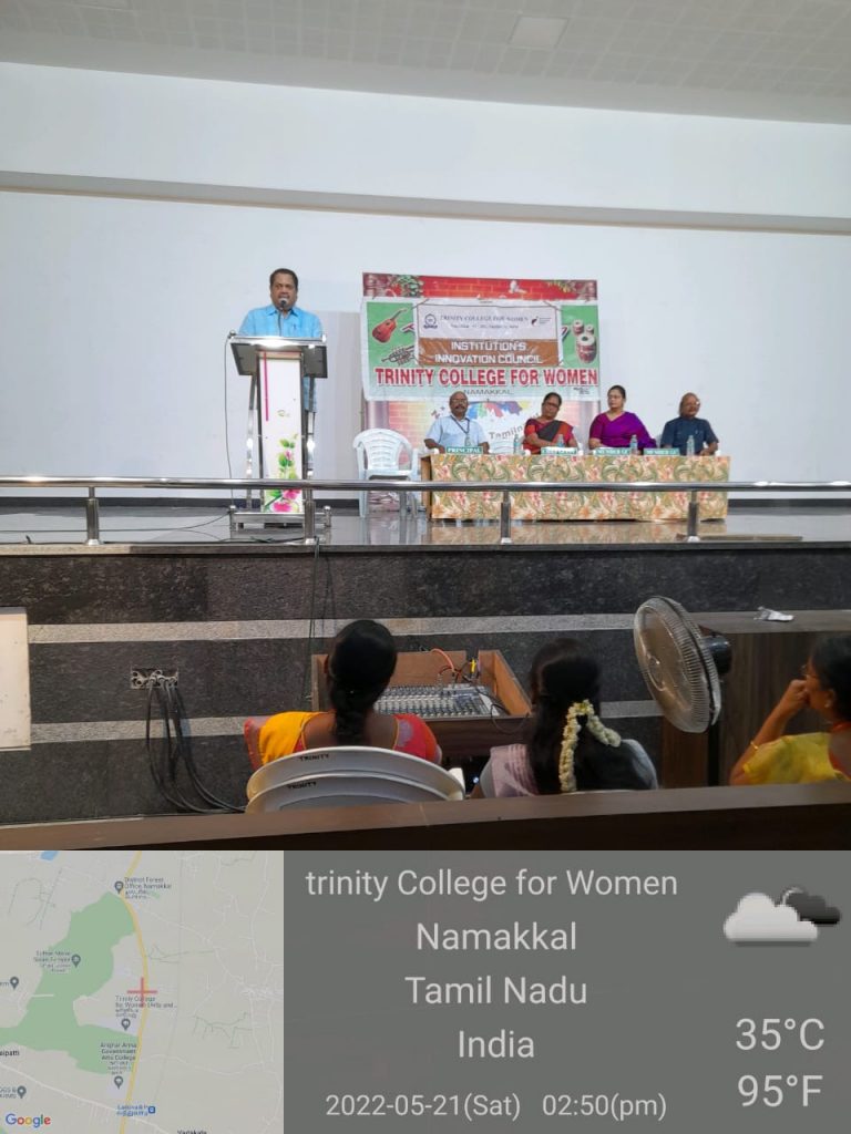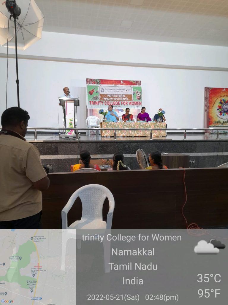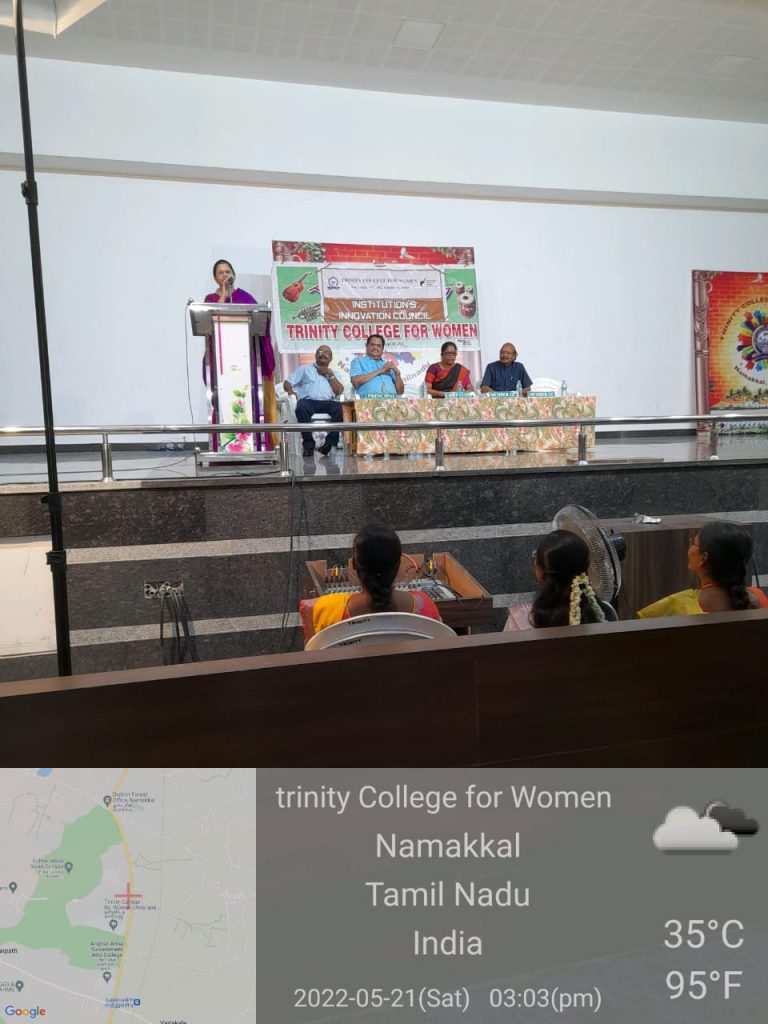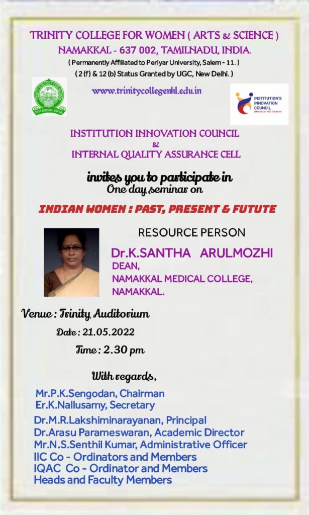 Internal Quality Assurance Cell and Institution Innovation Council of Trinity College for Women, Namakkal organized an event in the title of “Indian Women – Past, Present and Future” on 21.05.2022. It was held in Trinity Auditorium.