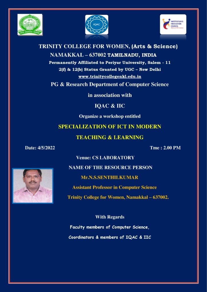 The Department of Computer Science in association with Internal Quality Assurance Cell and Institution’s Innovation Cell of Trinity College for Women, Namakkal organized a one day programme entitled “Specialization of ICT in modern teaching and learning” on 04.05.2022