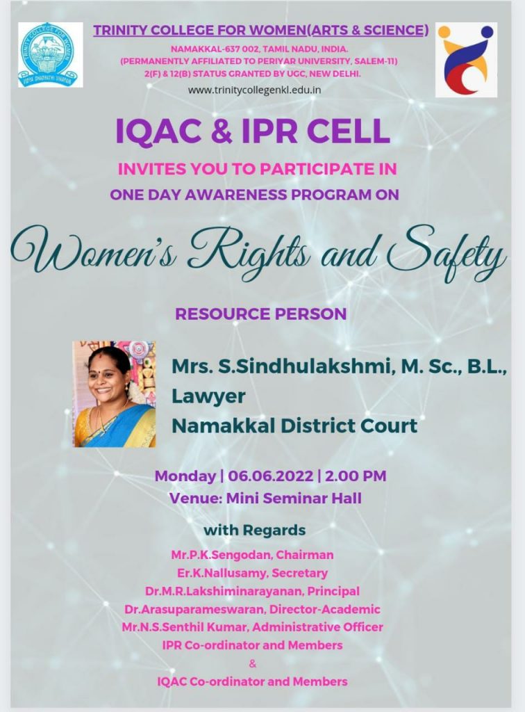 The Internal Quality Assurance Cell (IQAC) and Intellectual Property Rights Cell (IPR Cell) jointly organized a one day programme entitled “Women rights and safety” on 06.06.2022 @ 2 PM.