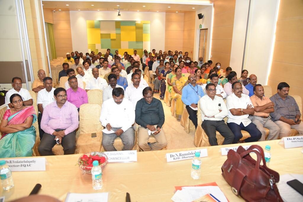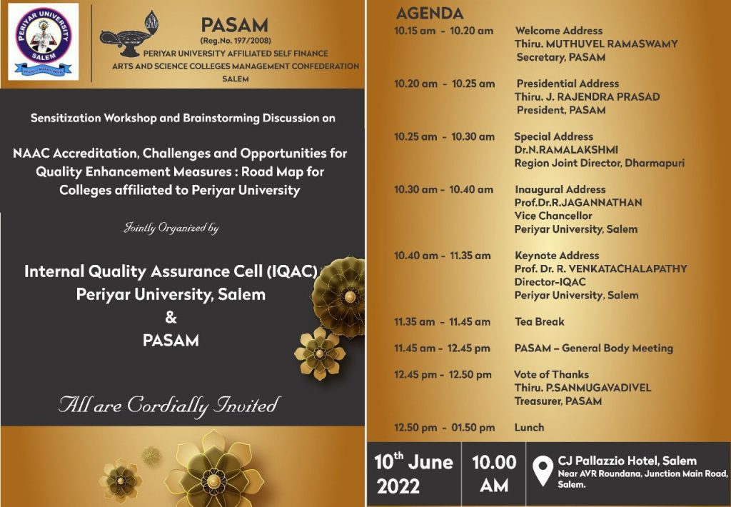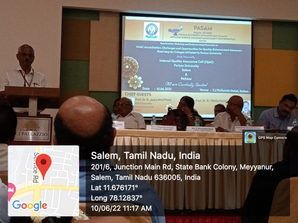 The organization of PASAM (Periyar University Affiliated Self Finance Arts and Science Colleges Management Federation), Salem and the Internal Quality Assurance Cell of Periyar University, Salem jointly organized a sensitization workshop entitled “Brainstorming discussion on “NAAC – Accreditation Challenges and Opportunities for Quality Enhancement Measures and Roadmap” for Colleges affiliated to Periyar University, Salem. It was held in the venue of VJ Pallazzio Hotel, Near AVR Roundana, Junction Main Road, Salem.