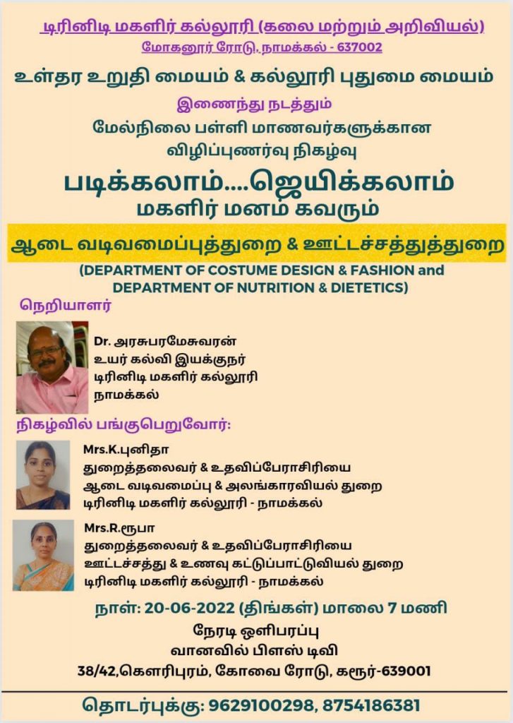 (The title of the Programme – “Impress on women’s mind about the Department of Costume Design and Fashion & Department of Nutrition and Dietetics” – மகளிர் மனம் கவரும் ஆடை வடிவமைப்பு துறை மற்றும் ஊட்டச்சத்து துறை)