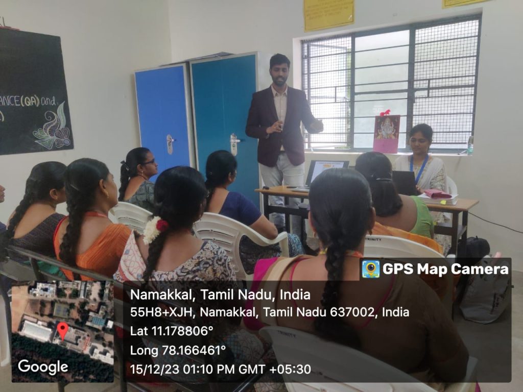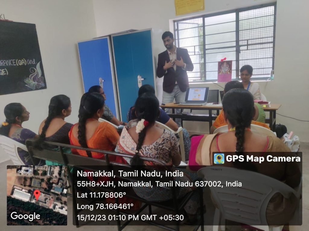 The Internal Quality Assurance Cell, in association with the Institutions Innovation Council, Trinity College for Women, Namakkal, organised a coordination programme entitled “Intellectual Property Rights, Patent Services, Industry Training, and Other Research and Developments” on December 15, 2023. It was held in the laboratory of computer science. Mr. Balaji Ramachandran, Chief Executive Officer (CEO), and Ms. S. Dhiventhra, Research Analyst-1 and Scientific Coordinator, Noobtron (P) Ltd., Chitlapakkam, Chennai, were the resource persons. They brought up the various services available, like research, development, book publications, patent and copyrights, industrial training, placement and recruitment, hospital and lab-based training, project guidance, internship programmes, etc.
