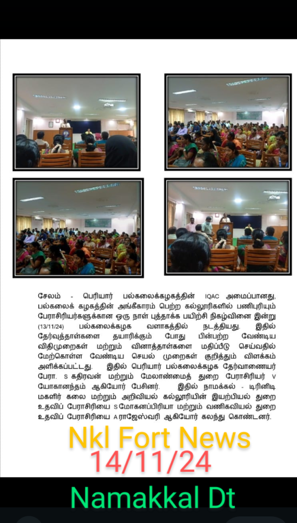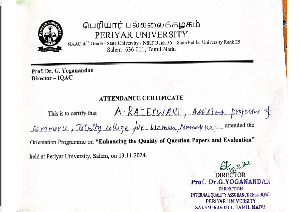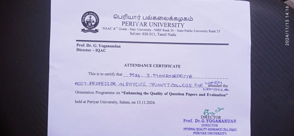 The Internal Quality Assurance Cell, Periyar University, Salem, conducted a one-day orientation programme titled “Enhancing the quality of question papers and evaluation” on 13.11.2024. It was held in the senate hall of the university campus. -On behalf of Trinity College for Women, Namakkal, Mrs. S. Mohanapriya, Assistant Professor in Physics and Mrs. A. Rajeswari, Assistant Professor in Commerce took part