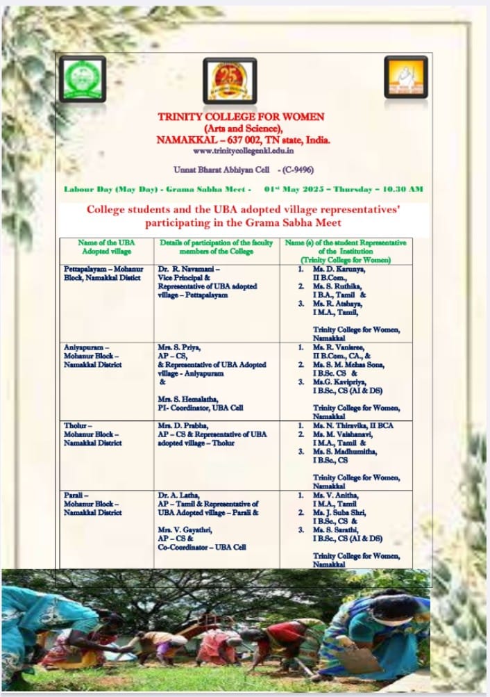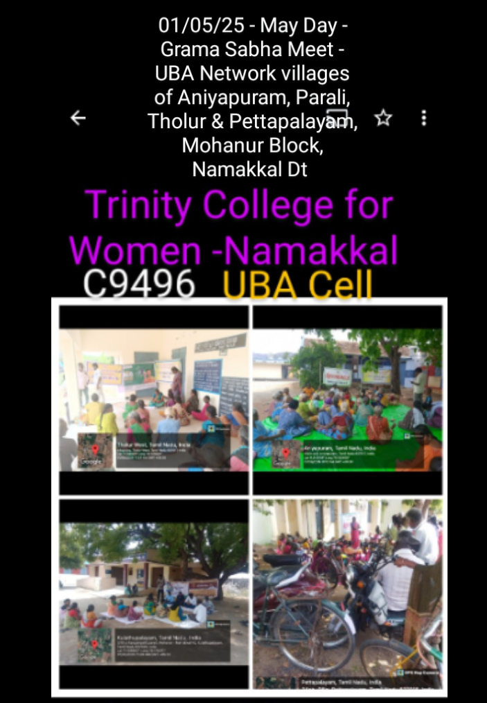 On this subject, on behalf of Unnat Bharat Abhiyan Cell (C-9496), Trinity College for Women, Namakkal, the village representatives, UBA Coordinator and the students have actively taken part in the UBA Network villages of Aniyapuram, Parali, Tholur and Pettapalayam, Mohanur Block, Namakkal District.