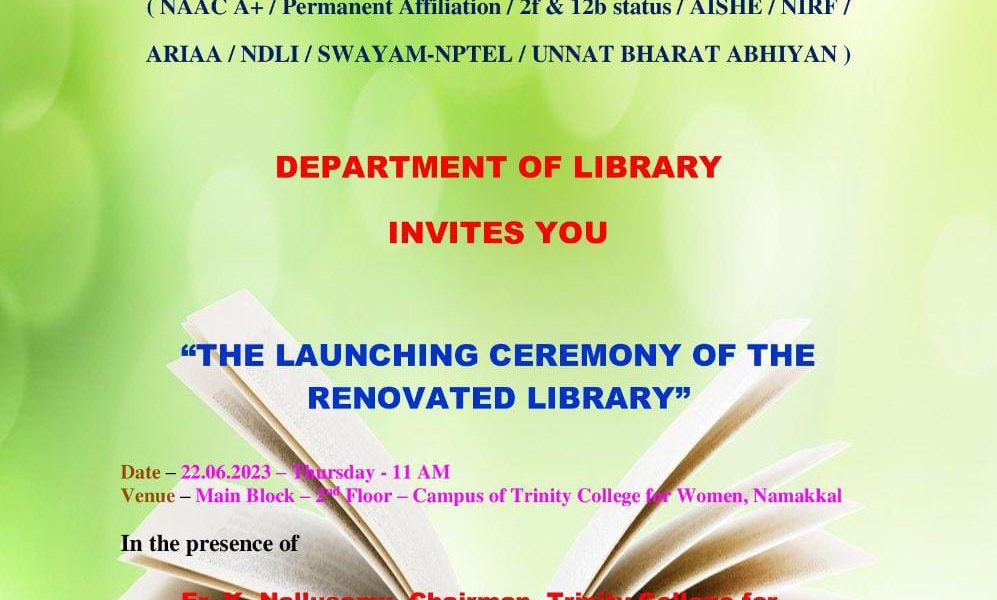 The launching ceremony of the renovated library was held on 22nd June 2023 in the premises of Trinity College for Women, Namakkal in the presence of Er. K. Nallusamy, Chairman and Mrs. Aruna Selvaraj, Executive Director.