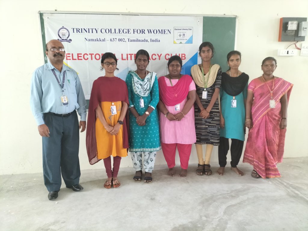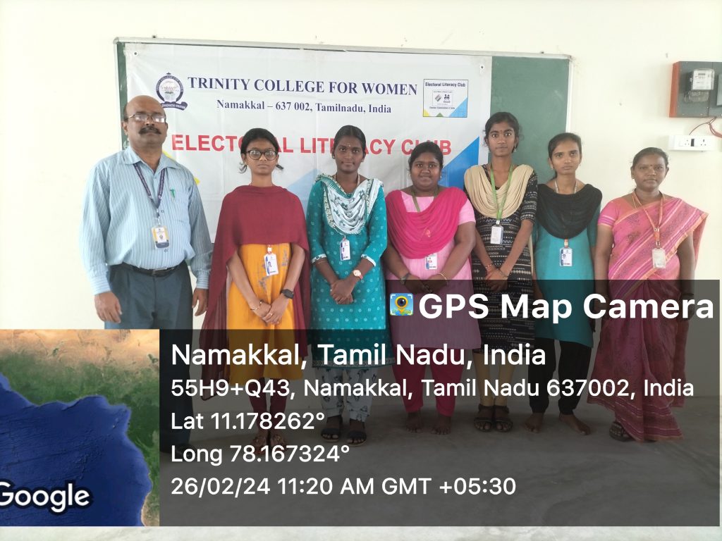 The District Election Officer, Namakkal District, has given a special cash prize of Rs. 500 (Rs. 100 each) to all the above-mentioned students for their active participation. All the students’ participants are greeted on February 26, 2024, on the college campus. Dr. M.R. Lakshiminarayanan, Principal, and Dr. R.A. Anitha, Coordinator, Electoral Literacy Club, Trinity College for Women, Namakkal, have conveyed their felicitations and given prizes to them.