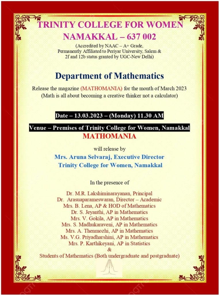 The magazine of “MATHOMANIA (Math is about becoming a creative thinker not a calculator) was released at a simple function held in Trinity College for Women, Namakkal on 13th March 2023.   The special invitee Mrs. Aruna Selvaraj, Executive Director released the magazine in the presence of Dr. M.R. Lakshiminarayanan, Principal, Dr. Arasuparameswaran, Director-Academic, the faculty of Mathematics Mrs. B. Lena, Dr. S. Jeyanthi, Mrs. V. Gokila, Mrs. S. Madhukaraveni, Mrs. P. Karthiekayani, Mrs. P. Nandhini, Mrs. A. Thenmozhi and Ms. V.G. Priyadharshini.
