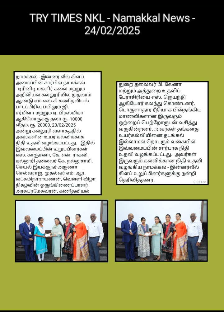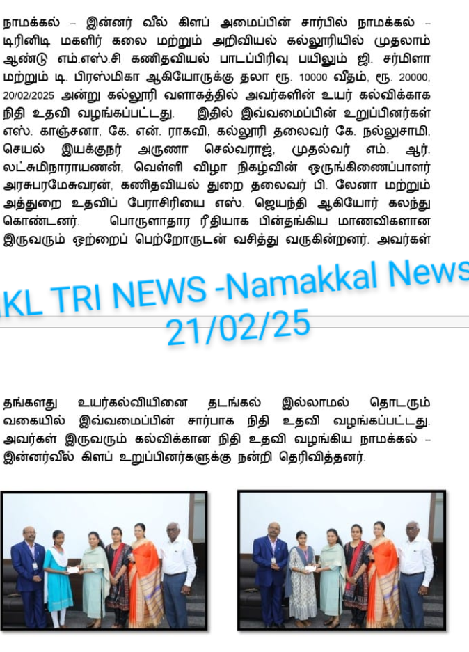 Both the above said students have a single parent.    Due to their family economic crisis, this amount was donated by the Inner Wheel Club, Namakkal.   The members of Inner Wheel Club, Mrs. S. Kanchana and Mrs. K. N. Rahavi, the Chairman of Trinity College for Women, Namakkal, Er. K. Nallusamy, The Executive Director, Mrs. Aruna Selvaraj, The Principal, Dr. M.R. Lakshiminarayanan, The Coordinator, Silver Jubilee Celebrations, Dr. Arasuparameswaran,  the HOD of Mathematics, Dr. B. Lena and the faculty member of Mathematics, Mrs. S. Jeyanthi also took part on that occasion.