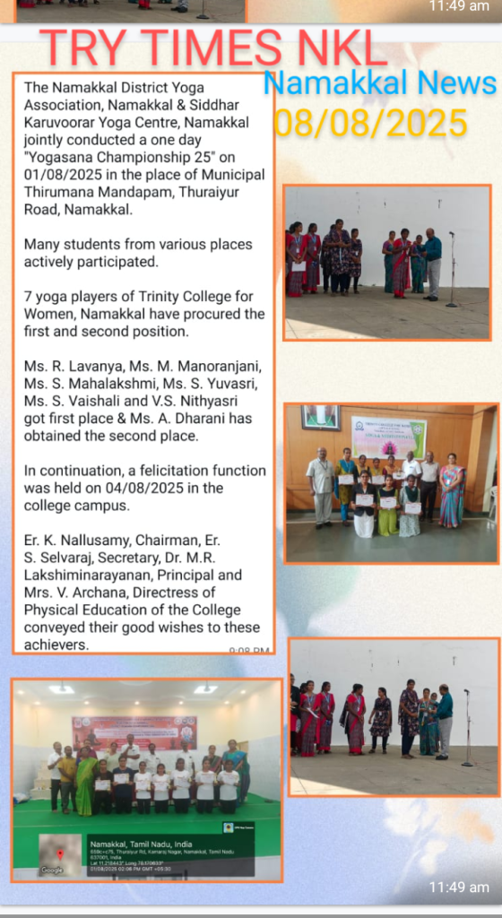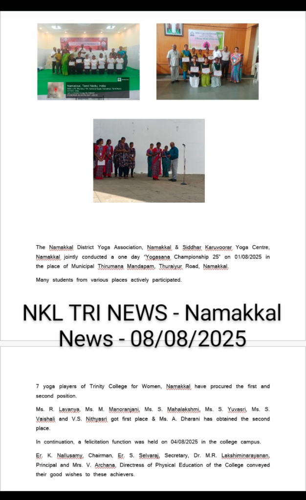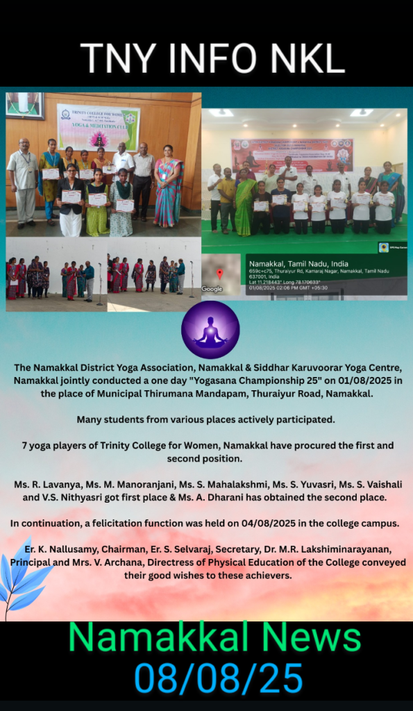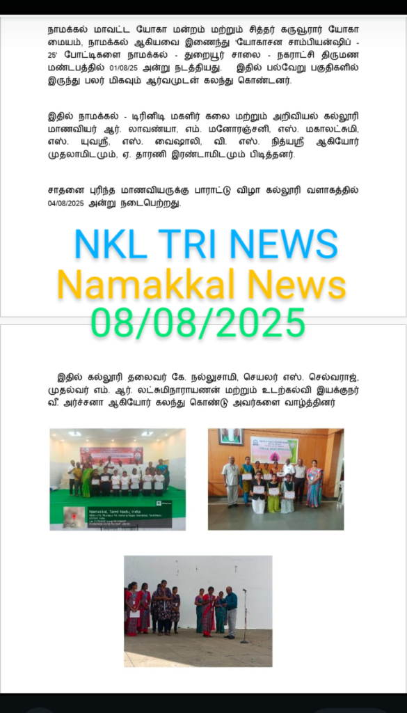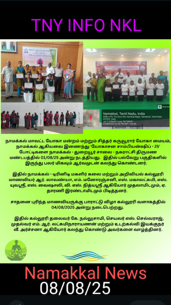 The Namakkal District Yoga Association, Namakkal & Siddhar Karuvoorar Yoga Centre, Namakkal, jointly conducted organized a one day programme titled “Inter District Yogasana Championship” and “Namakkal District Team Selection 2025”, held at the place of Municipal Thirumana Mandapam, Thuraiyur Road, Namakkal on 01.08.2025.