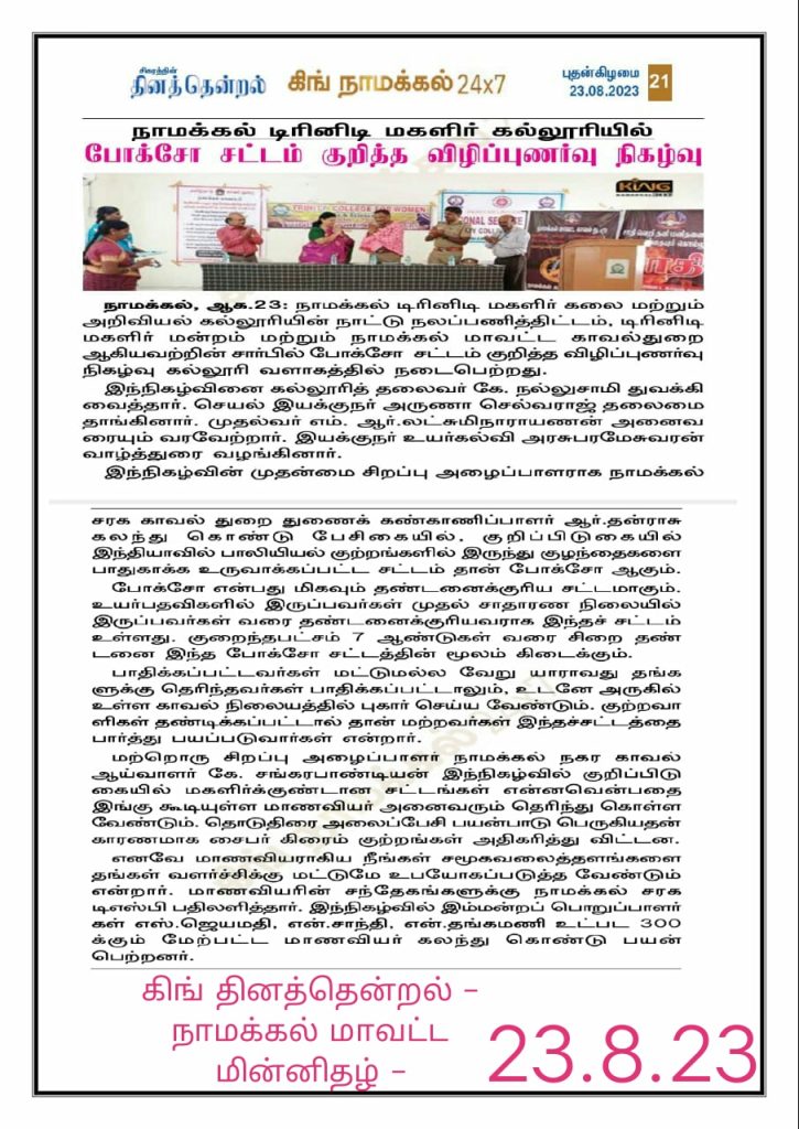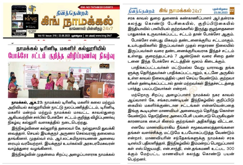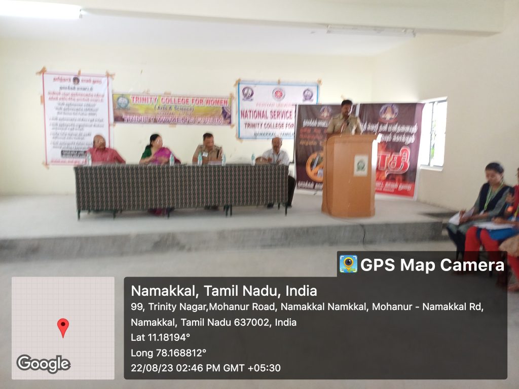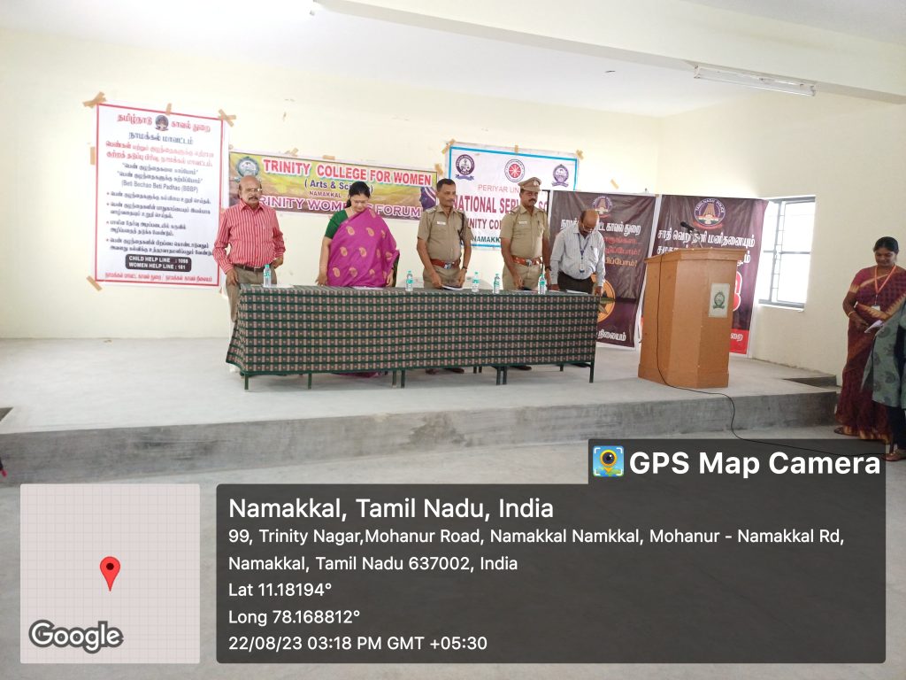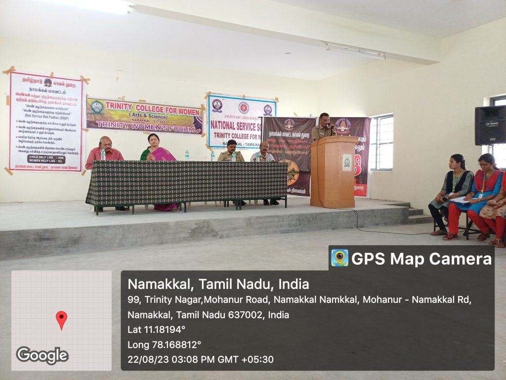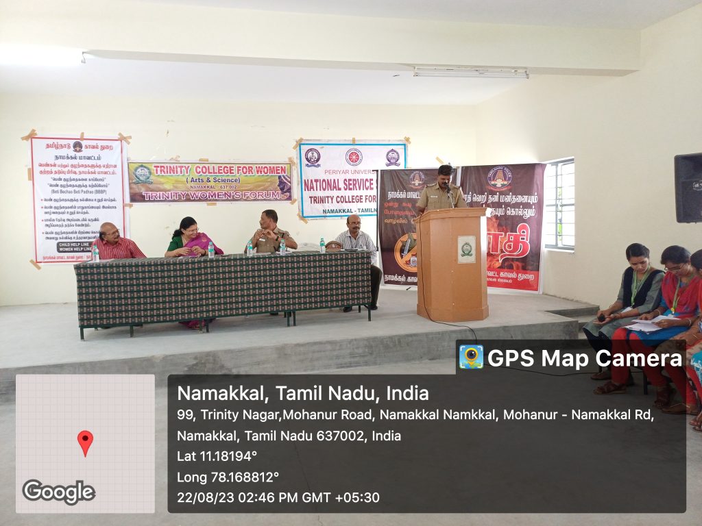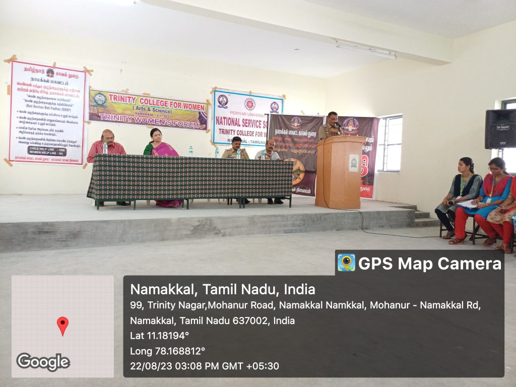 The National Service Scheme and Trinity Women’s Forum of Trinity College for Women, Namakkal, with the support of the Police Department of Namakkal District, organised a programme on “Overall Picture of POCSO Act” (போக்சோ சட்டம் குறித்த ஒரு கண்ணோட்டம்) on August 22, 2023, on the College campus. Er. K. Nallusamy, Secretary of the College, inaugurated the programme. Mrs. Aruna Selvaraj, Executive Director, presided over the programme. Dr. M.R. Lakshiminarayanan, Principal, welcomed the gathering. Dr. Arasuparameswaran, Director, Academic, delivered the felicitation address.