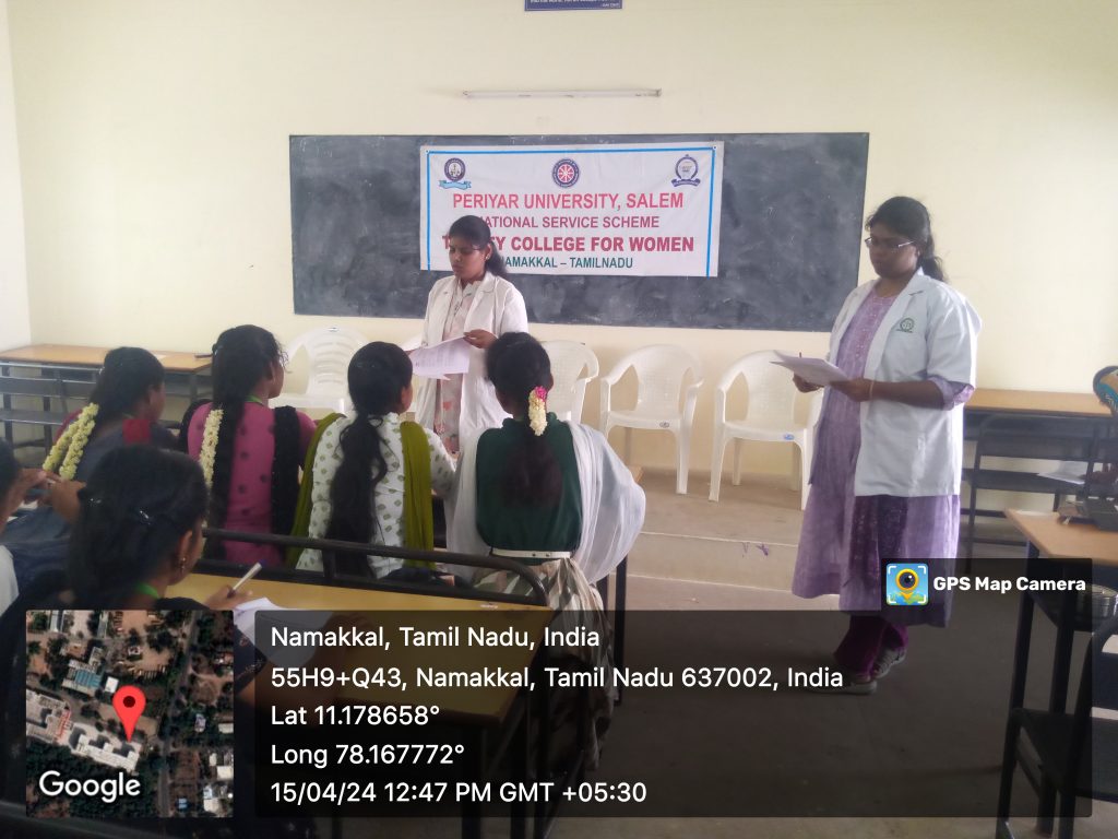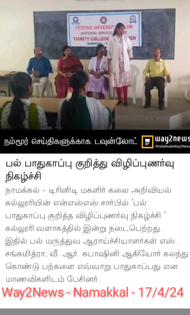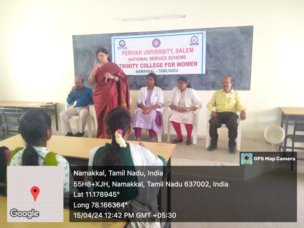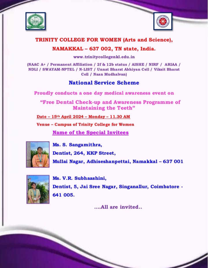 The National Service Scheme, Trinity College for Women, Namakkal, conducted a one-day medical awareness event entitled “Free dental check-up and awareness program of maintaining the teeth” on April 15, 2024. It was held on the college premises. The names of the special invitees were Ms. S. Sangamithra, Dentist, 264, KKP Street, Mullai Nagar, Adhiseshanpettai, Namakkal, and Ms. V.R. Subhaashini, Dentist, 5, Jai Sree Nagar, Singanallur, Coimbatore.