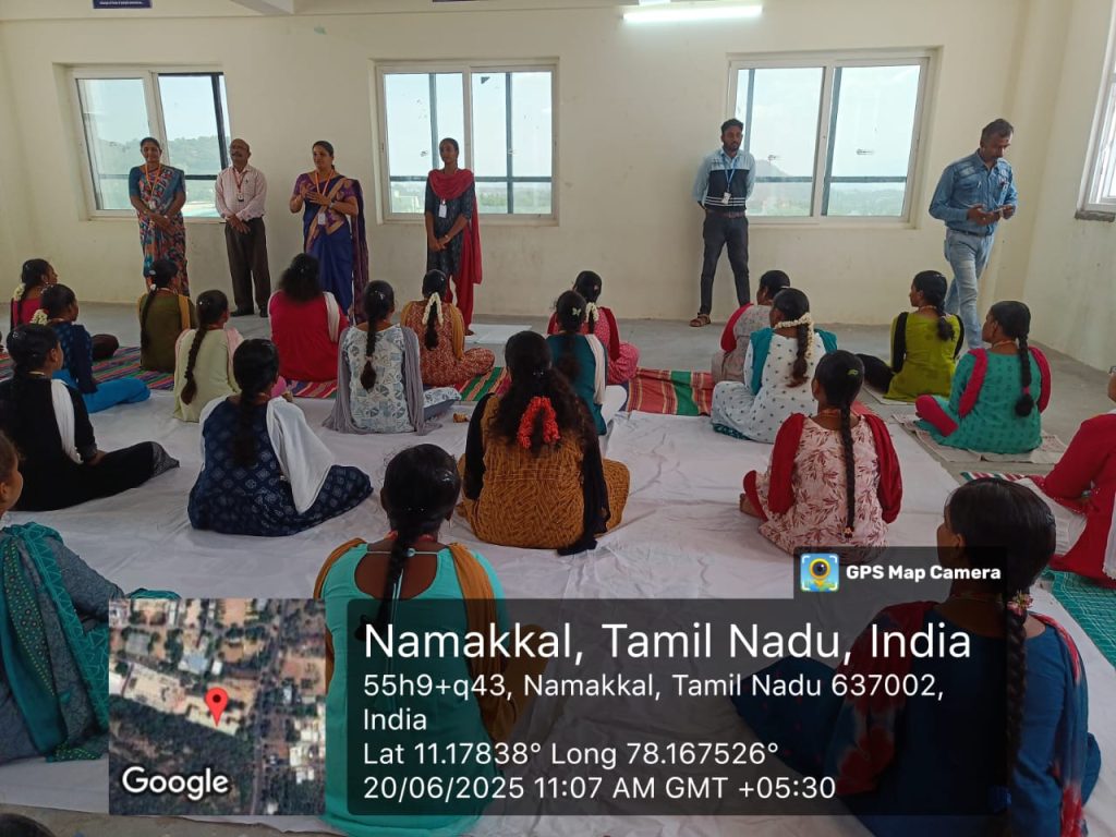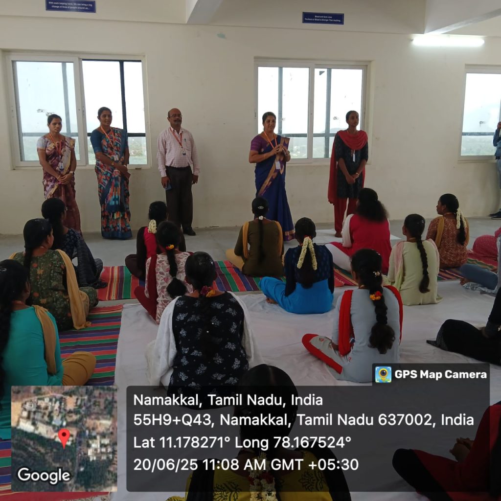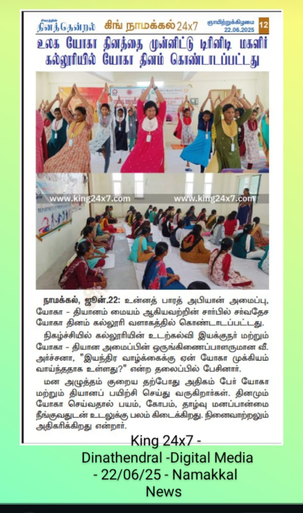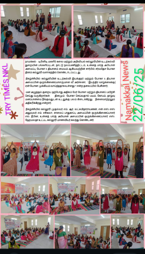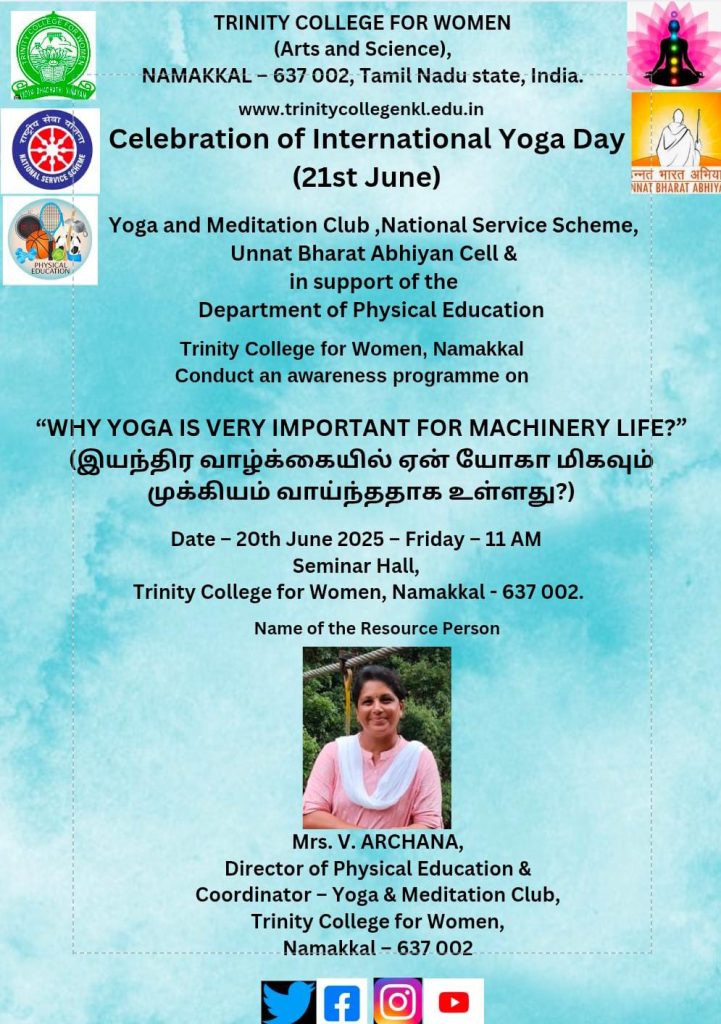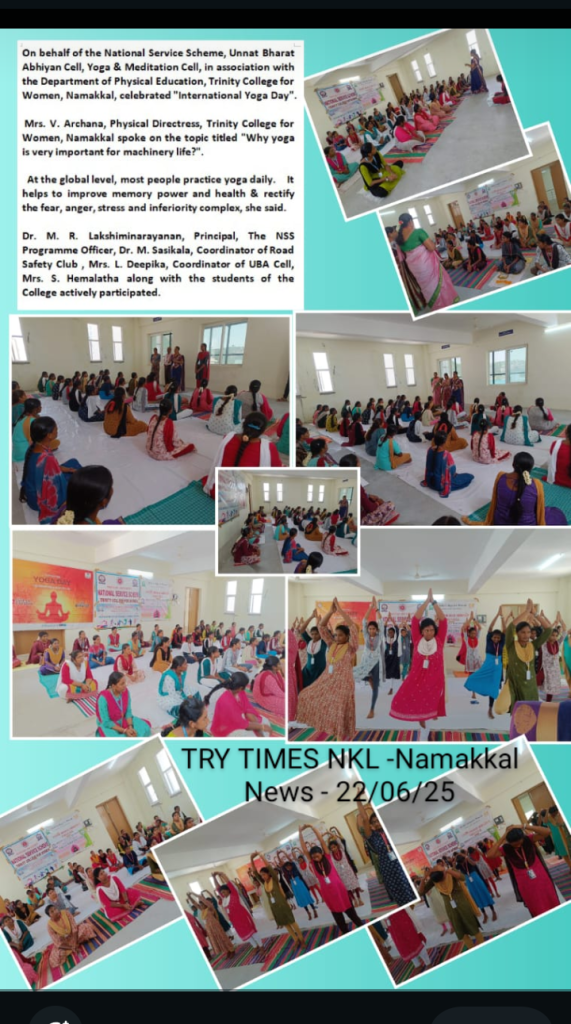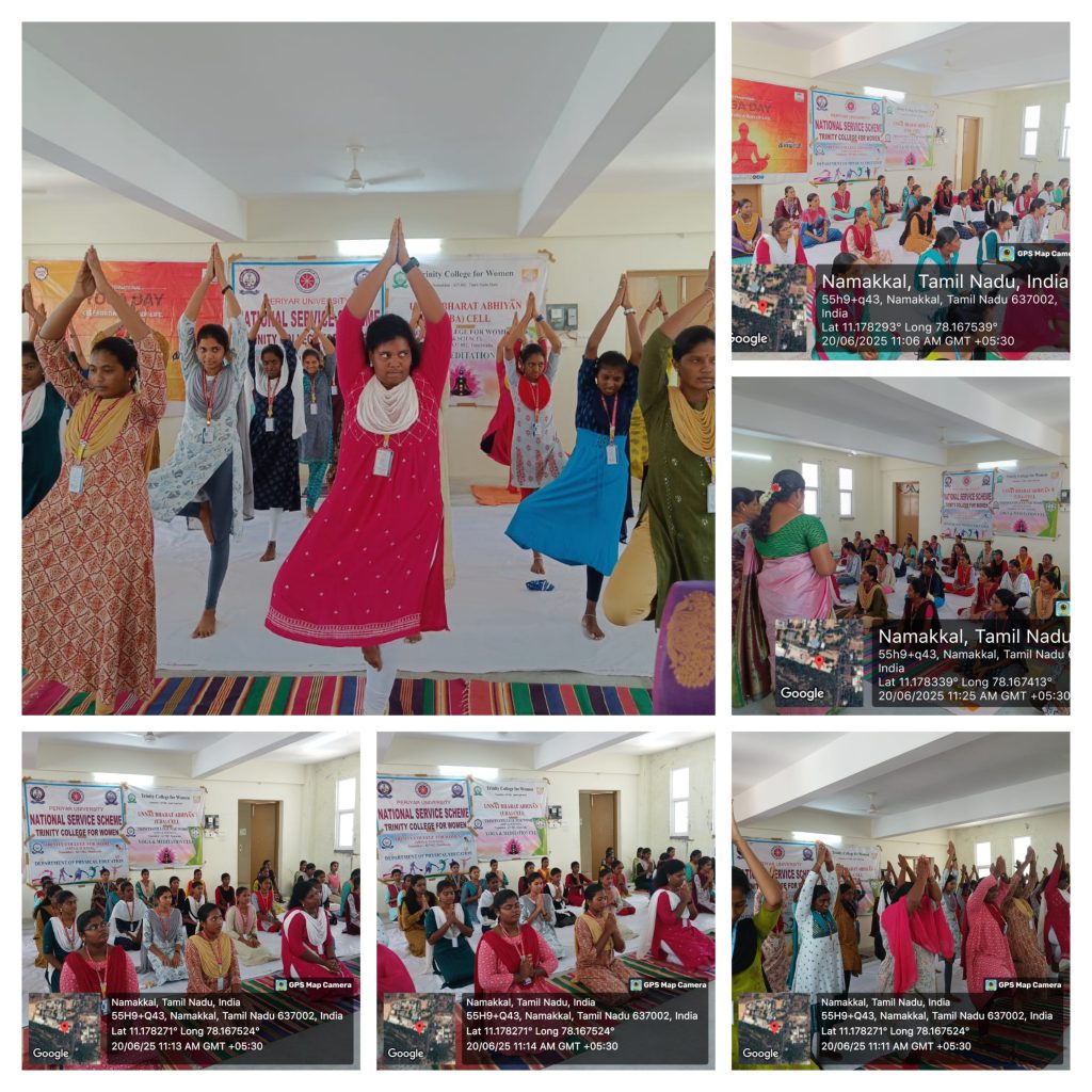 The National Service Scheme, Unnat Bharat Abhiyan Cell and Yoga & Meditation Club, in support of the Department of Physical Education, Trinity College for Women, Namakkal, celebrated Yoga Day on 20th June 2025 on the College premises